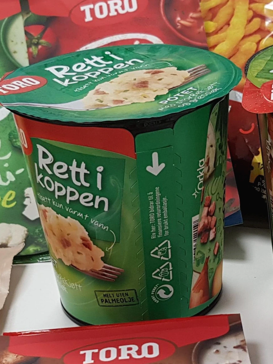 소비자의 소비성향과 기업의 사회적 책임을 위해 Orkla는 제품 패키징도 자연을 최대한 오염시키지 않는 재활용 가능한 것으로 생산하고 있어요. 예를 들면, 이 간편식 용기는 플라스틱의 재활용을 위해 플라스틱 자체를 코팅하거나 도색하는 대신, 그 위에 재활용 가능한 종이로 덮었죠. 사용 후 쉽게 종이와 플라스틱이 분리되도록 절취선을 만들어 디자인했죠"