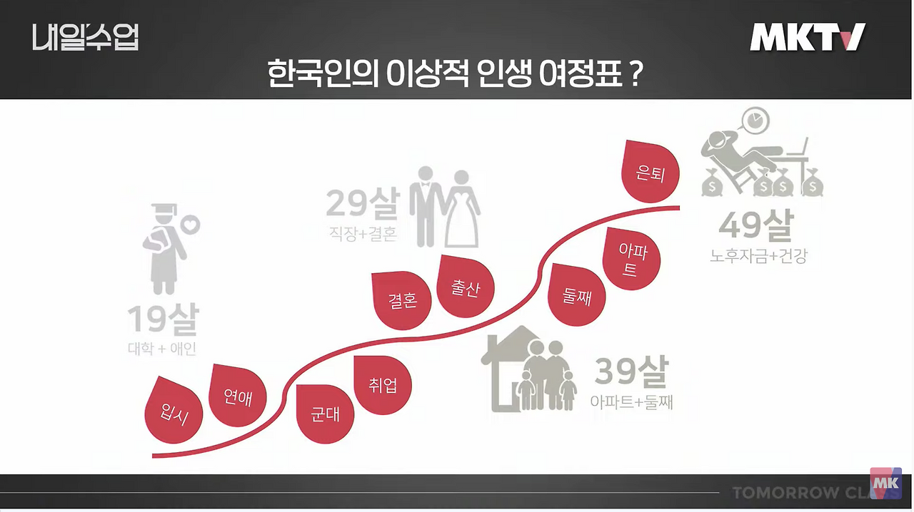 평생 끝나지 않는 레이스와 획일적인 삶의 압박. 우리나라 최고의 데이터 분석가이자 <그냥 하지 말라>의 저자 송길영은 유튜브 'MKTV 내일 수업'에서 한국 사회에는 대부분의 인생의 대소사에 '적령기'가 만연하다고 비판했다. 그는 데이터를 근거로 우리나라의 모든 연령대에서 죽을 때까지 고민하는 3가지 키워드를 제시했는데 바로 시간, 돈, 나이다. 시간은 없는데 평생 나이에 따라 해야 할 것들이 정해져 있고, 사회적 평균값이 정해지는 셈이다.