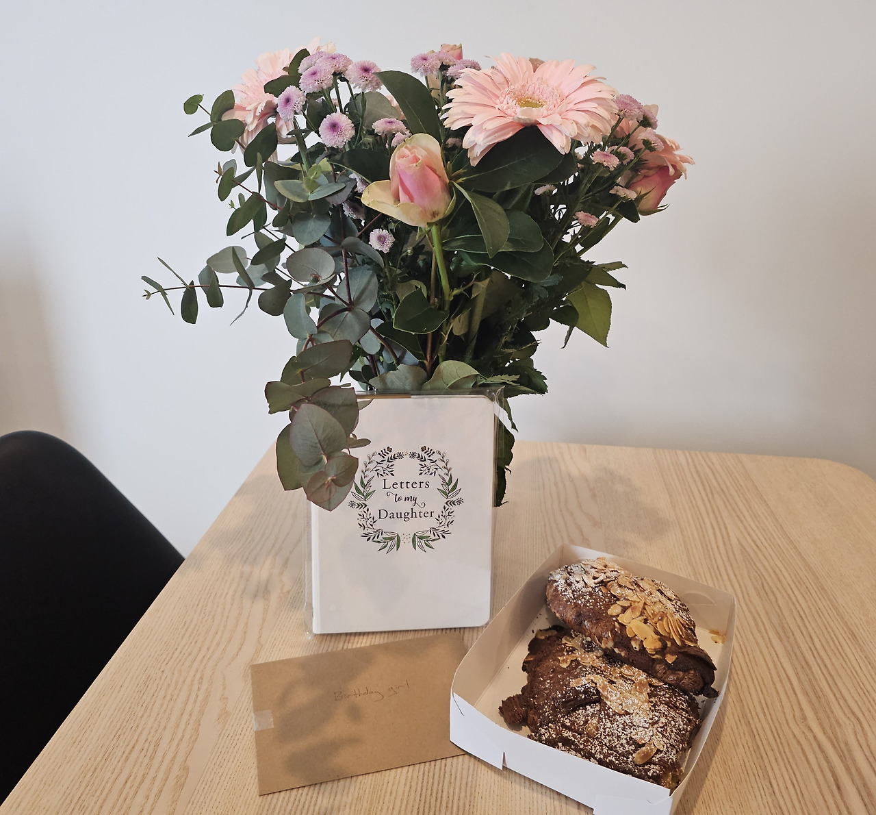 매년 찾아오는 생일이 뭐 별 것인가 싶다가도, 가장 소중한 사람들의 따뜻한 인사만으로도 그날 하루는 1년 중 가장 행복한 하루가 되는 것 같다. 한동안 따뜻한 남편의 품 안에서 머물다 테이블 위에 놓인 무언가에 눈길이 닿았다. 테이블 위에 놓여 있는 선물과 엽서, 내가 가장 좋아하는 동네 빵집의 아몬드 크로와상까지. 이 크로와상이 먹고 싶어 얼마전 베이커리에 다녀왔지만, 다 팔려서 사지 못했었는데...