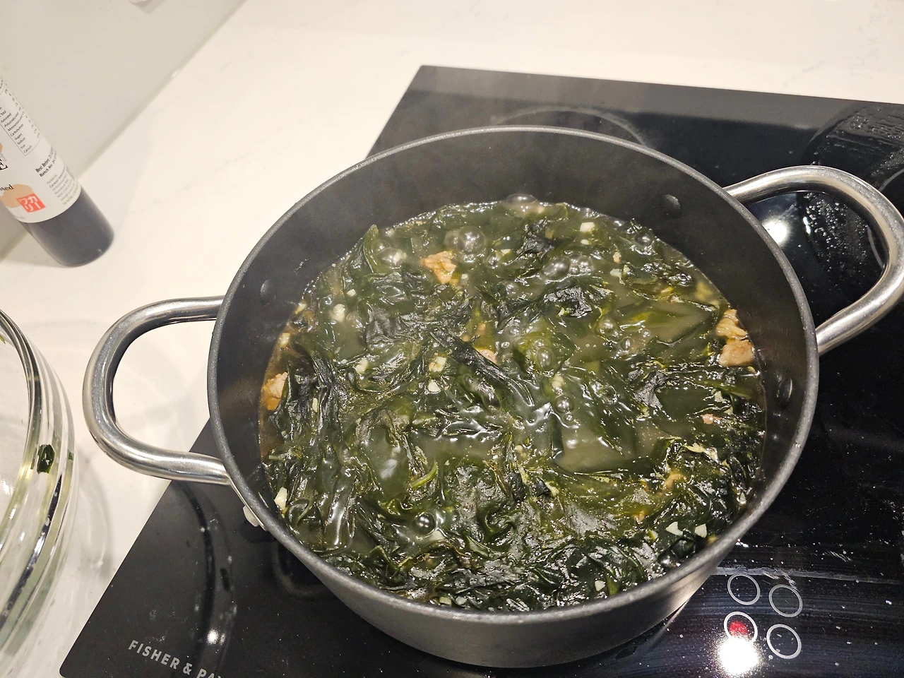 맛있겠다는 내 말에, 남편은 이거 먹고 더 이상은 내가 끓인 미역국을 먹고 싶지 않을지도 모른다고 너스레를 떤다. 잘 익은 우둔살을 큰 냄비에 넣고, 참기름과 미역을 둘러 살짝 볶은 후 물을 채운다. 이제 복잡한 과정은 끝났다.