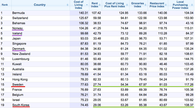 2년 동안의 학비도 학비지만, 유학 생활을 위해서는 기숙사비, 식비, 교통비, 통신비 등 다양한 항목에서 지출이 발생하기 때문에 스웨덴의 집세나 마트 물가가 얼마인지 굉장히 궁금하실 텐데요. 우선 세계 생활비 지수를 나타낸 표를 보면 스웨덴은 15위, 대한민국은 19위에 랭크되어 있어요. 전체 물가는 한국보다 조금 더 비쌀지 모르지만 이 역시도 각자가 공부하는 지역에 따라 다르고, 스웨덴에서는 학생의 경우 다양한 학생 할인 혜택을 누릴 수 있기 때문에 저 같은 경우에는 실제로 서울에서 살았을 때보다 10~ 15% 정도 절약을 하고 있답니다. 그렇다면 다른 학생들은 어떻게 먹고살고 있을까요? (*아래 링크를 클릭해주세요!)
