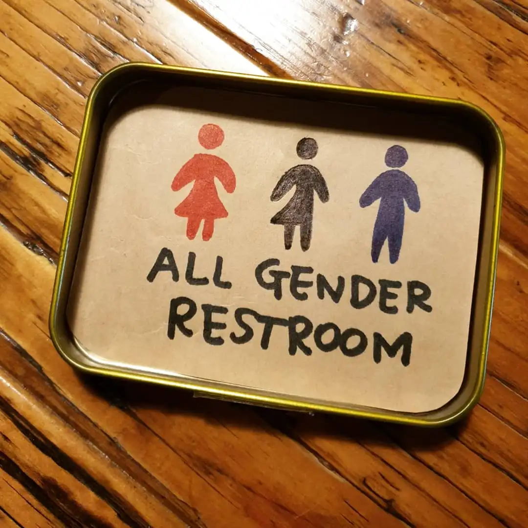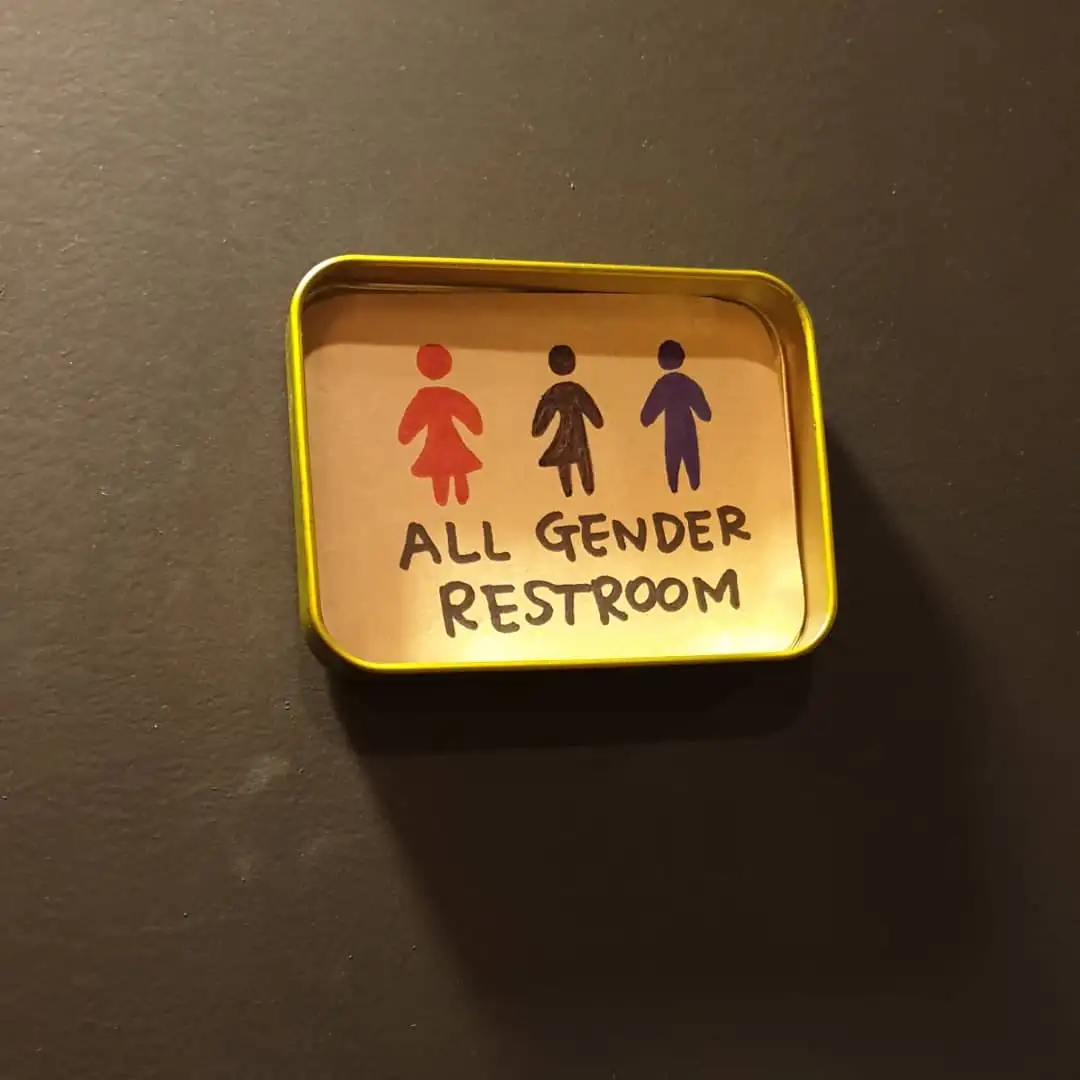 티캔 뚜껑에 직접 그려서 문에 붙인, 성중립화장실 표시.