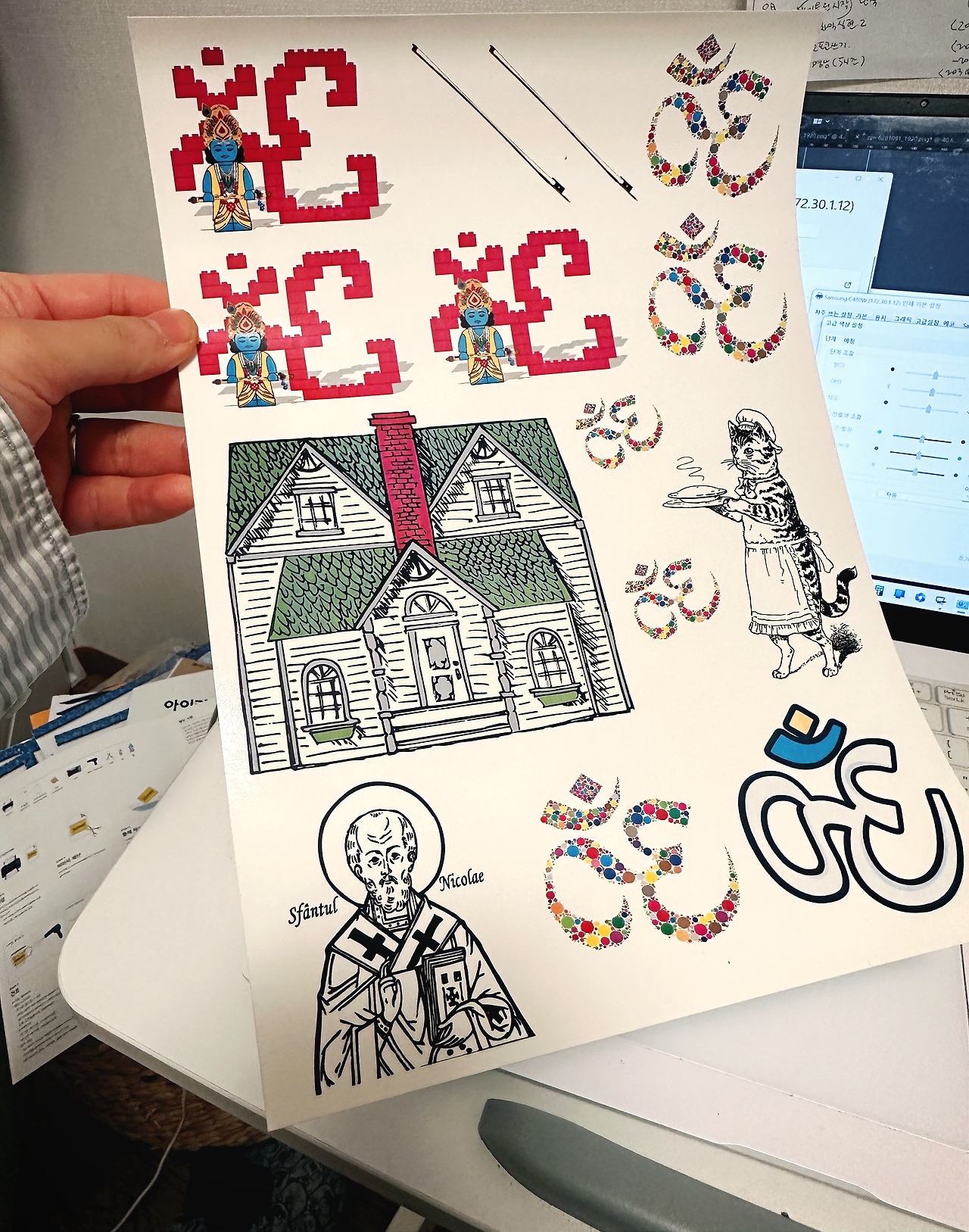 일러스트레이터(무료체험판을 썼다) 파일로 a4용지 한 장 가득 배열하고, 전사지에 딸려온 설명대로 프린터 설정 완료. 하지만 별도의 수동급지대가 없는 레이저복합기여서 과연 인쇄가 될까 조마조마했는데 다행히 걸리지 않고 잘 나왔다.