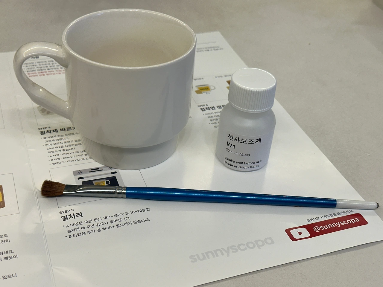 : 전사한 머그를 100도씨의 오븐에 구워 말리고(드라이어나 전자레인지로도 가능), 필름 제거 후 강도를 높이기 위해 200도씨에 한 번 더 구웠다. 충분히 말렸다고 생각했는데도 필름 제거 시 잉크가 함께 벗겨지는 부분이 있다. 흑. 완전히 마르는 온도와 시간에 대한 노하우가 필요.