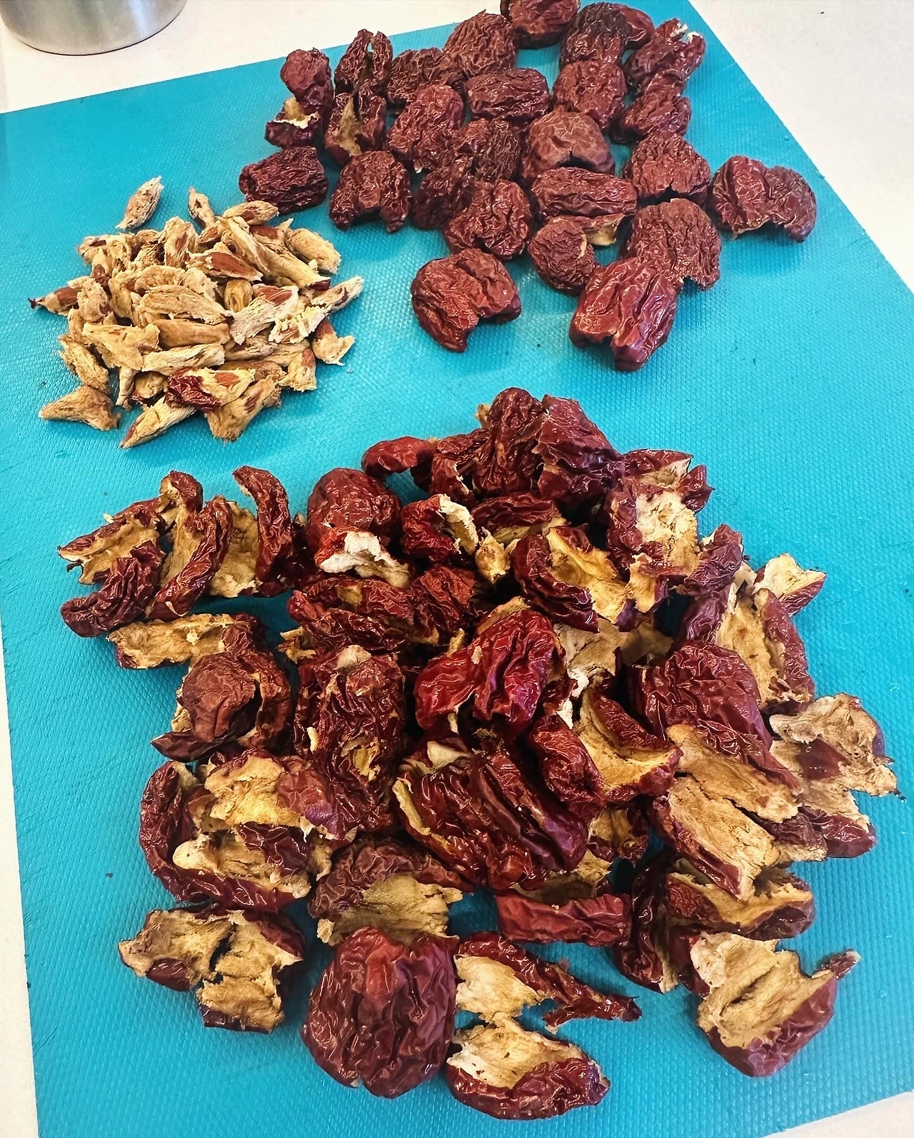 본래 대추에는 단맛이 있으니 설탕을 넣지 않고 대추고를 만들어보기로. 국산 건대추의 씨를 발라내려니 과육에 딱 붙어 잘 떨어지지 않는다(Tip: 하룻밤 불리면 훨씬 수월함). 분리한 씨들을 티백에 담아 먼저 끓이고(과육과 함께 끓여도 무방), 다시 과육을 넣어 달이는데 약 2시간. 물이 자작하게 졸았을 때 전체적으로 블렌더에 갈아 한 번 더 달여주었다.