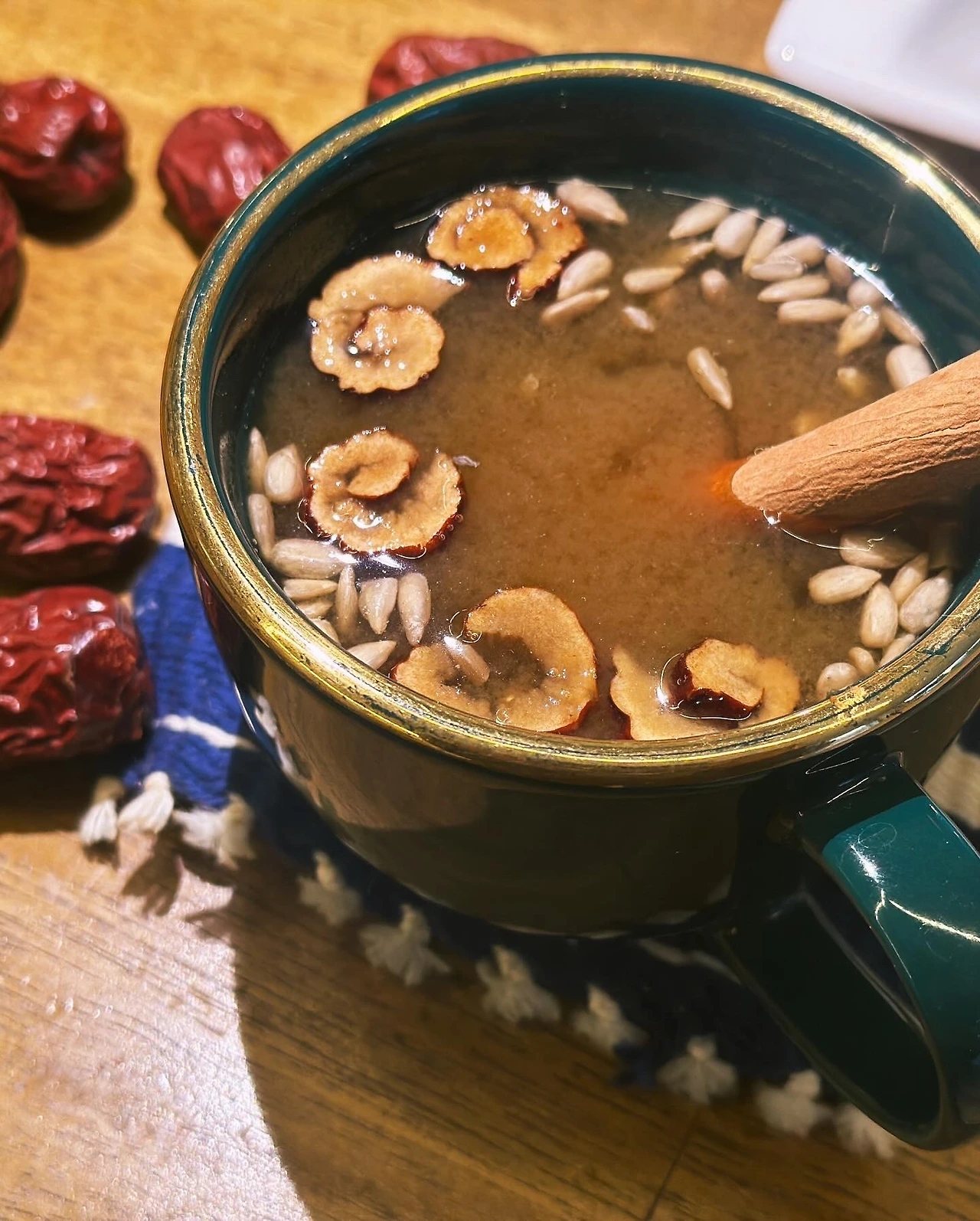 건강에 유익한 물질이 농축되도록 약불에서 진하게, 더 진하게. 용암처럼 퍽, 또는 침(?)처럼 퉤!하고 예고 없이 튀면서 걸쭉해진 액체는 점성이 상당한 대추고가 됐다. 기호에 맞게 뜨거운 물을 붓고 씨앗류와 시나몬 등을 더해 마시면 숙면과 면역력에도 그만인 홈메이드 대추차 완성!