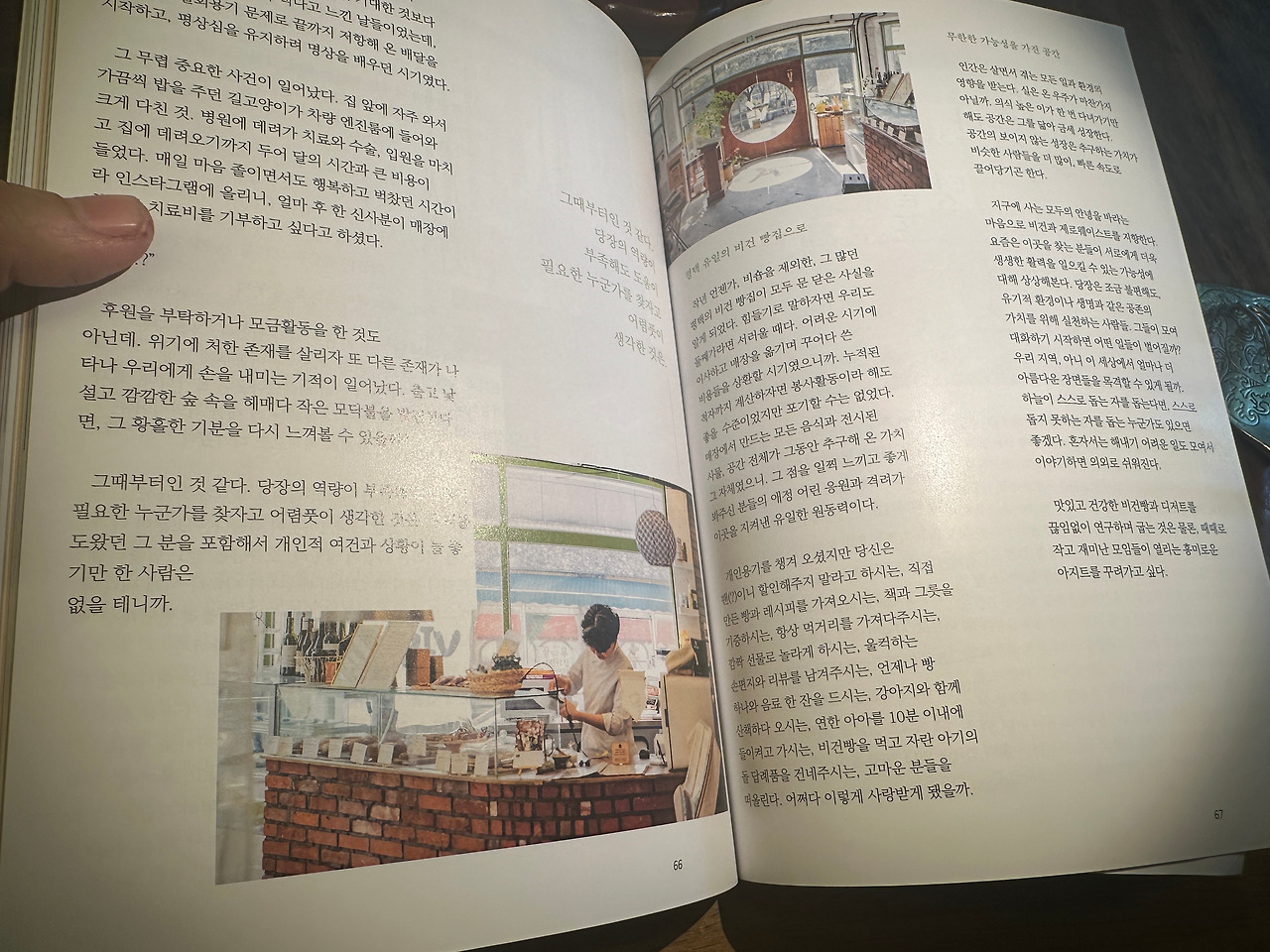 지구에 사는 모두의 안녕을 바라는 마음으로 비건과 제로웨이스트를 지향한다. 요즘은 이곳을 찾는 분들이 서로에게 더욱 생생한 활력을 일으킬 수 있는 가능성에 대해 상상해본다. 당장은 조금 불편해도, 유기적 환경이나 생명과 같은 공존의 가치를 위해 실천하는 사람들. 그들이 모여 대화하기 시작하면 어떤 일들이 벌어질까? 우리 지역, 아니 이 세상에서 얼마나 더 아름다운 장면들을 목격할 수 있게 될까. 하늘이 스스로 돕는 자를 돕는다면, 스스로 돕지 못하는 자를 돕는 누군가도 있으면 좋겠다. 혼자서는 해내기 어려운 일도 모여서 이야기하면 의외로 쉬워진다.