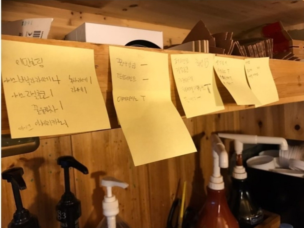 한 달에 몇 번씩 들어오는 촬영장의 케이터링은 선뜻 따라가기 망설여질만큼 낯설었다. 영화나 드라마의 촬영지를 찾아가 배우와 스텝들이 쉬는 시간에 맞춰 집중적으로 음료와 간식을 제공하는 일이었다. 배우의 팬클럽이나 소속사, 작가로부터 적게는 음료 100잔부터 많게는 400~500잔과 간식을 예약받는데, 짧은 시간에 많은 양을 제공하는 방식이라 정신이 하나도 없었다. 주문 받은 음료를 만들기도 바쁜데, 각 팀에서 음료가 언제 나오는지 알려달라거나 변경을 요청하는 일이 잦았다. 그렇게 밀린 주문지를 찾아 수정하다 보면 순서는 헷갈리고 음료 제공은 계속 지체되는 악순환! 많은 스텝들을 웃으며 여유롭게 대하는 남자친구가 새삼 대단해보였다.