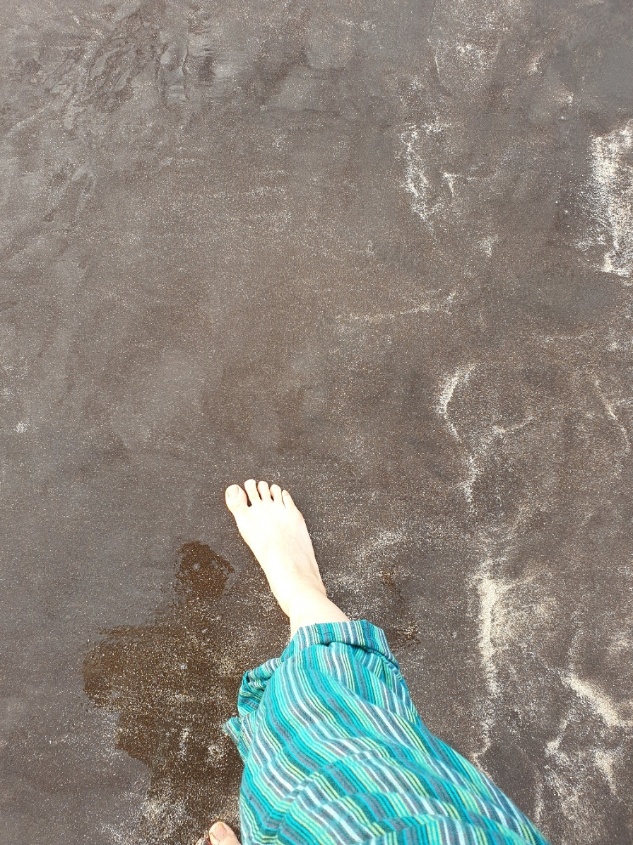 녀석과의 관계 형성을 포기하고, 저녁을 먹기까지 시간이 남아 #삼양해수욕장에 들렀다. 지자체에서 관리하지 않는, 비교적 덜 알려진 이 해수욕장의 시그니처인 검은 모래는 화산암의 오랜 침식작용으로 만들어진다. 철분이 풍부한 모래가 관절염과 신경통에도 좋다고 해서 따뜻한 모래를 밟다가 바지를 접어 올렸다. 미지근한 바닷물에 발을 담그고 해변을 걸으니, 부드럽고 폭신한 모래와 바닷물의 감촉이 마치 '여기는 제주도, 네가 모르는 세계야.'라고 말하는 듯했다. 검은 모래가 그려내는 물결의 흔적이 아름다워 한참을 바라보다 발로 쓱쓱 그림도 그려보았다. 금세 투명하고 잔잔한 파도가 밀려와 그림을 사르르 지워내며, 부질없음을 속삭인다.