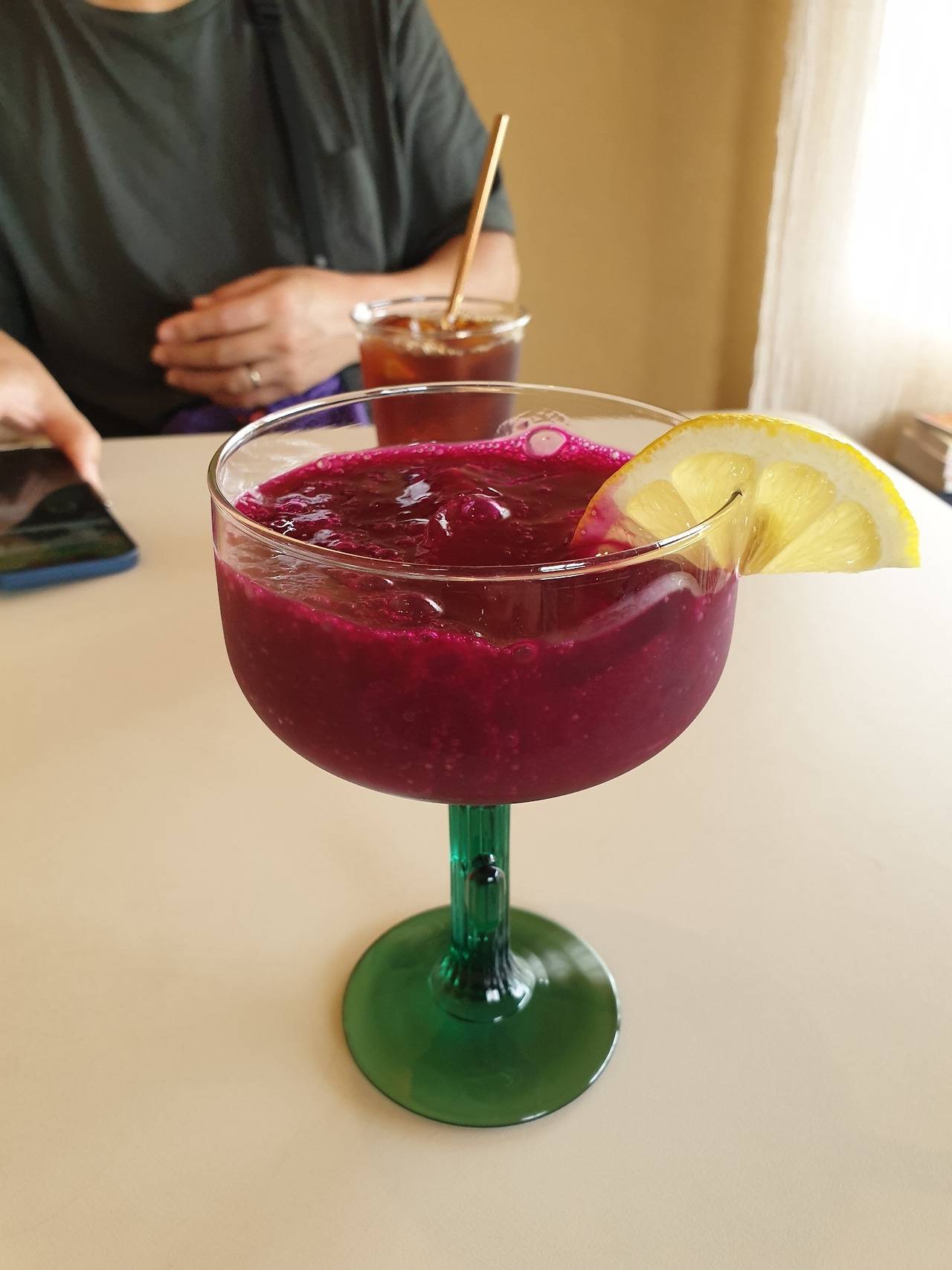 오래된 갈색 알루미늄 새시문을 열고 들어서자, 기이하리만치 마음이 차분해지는 인센스 향이 먼저 마중을 나왔다. 좁은 계단을 올라가면 다락방처럼 2층에 위치한 이 가게의 테이블 수는 3개. 처음 보는 <백년초 주스>와 드립 커피를 주문했는데, 주스는 식감이 좀 생소할 거라고 하셨다. 선명한 자줏빛에 이끌려 겁 없이 주스를 입에 가져갔는데, 순간 젤리처럼 뭉글뭉글하면서도 끈적한 느낌에 낫또처럼 딸려오는 실까지 쭈우욱. 깜짝 놀라고 말았다. 마와 알로에를 함께 갈아 마시는 듯한 보기와는 딴판의 식감. 미끌거리는 내용물이 한입에 후루룩 딸려오는 느낌이 새콤달콤한 맛과 무척 대비된다. 이상해, 이상해 하다 보면 어느새 한 컵을 뚝딱하게 되는 것도 이상했다.