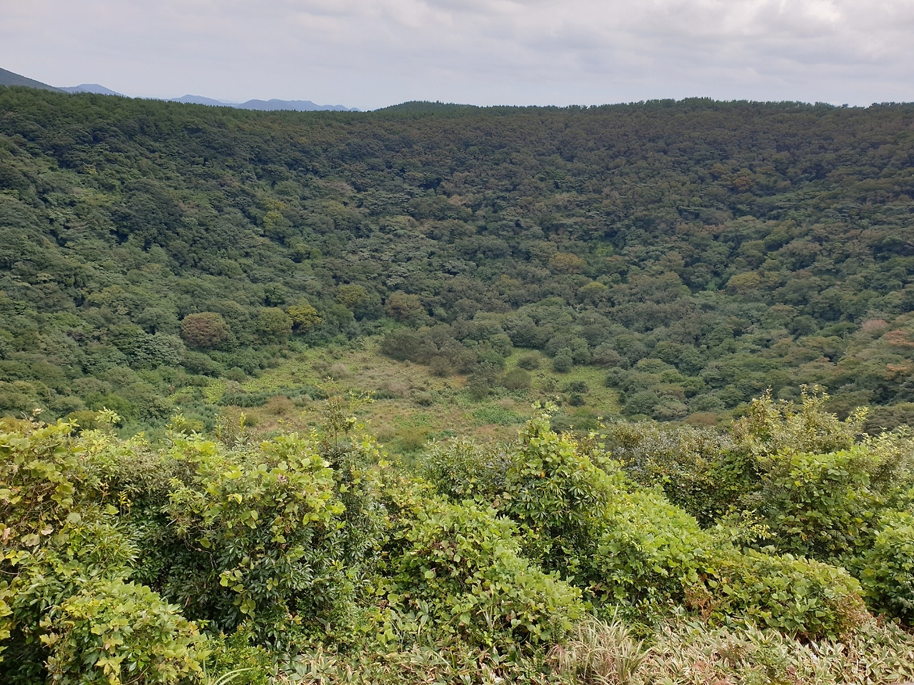 찬찬히 나와 아점으로 손칼국수를 먹고, 억새밭이 아름답다는 #산굼부리를 찾아갔다. 아직 만개하지 않은 억새들이 산책로에 가득하다. 10월에 왔다면 새품, 즉 하얀 꽃의 물결을 볼 수 있었겠지만 9월 말의 억새들은 꽃이 될 가능성을 품은 쪽이 훨씬 많았다. 억새 명소로 알고 찾아간 산굼부리의 본질은 억새가 아닌 '굼부리'에 있었다.