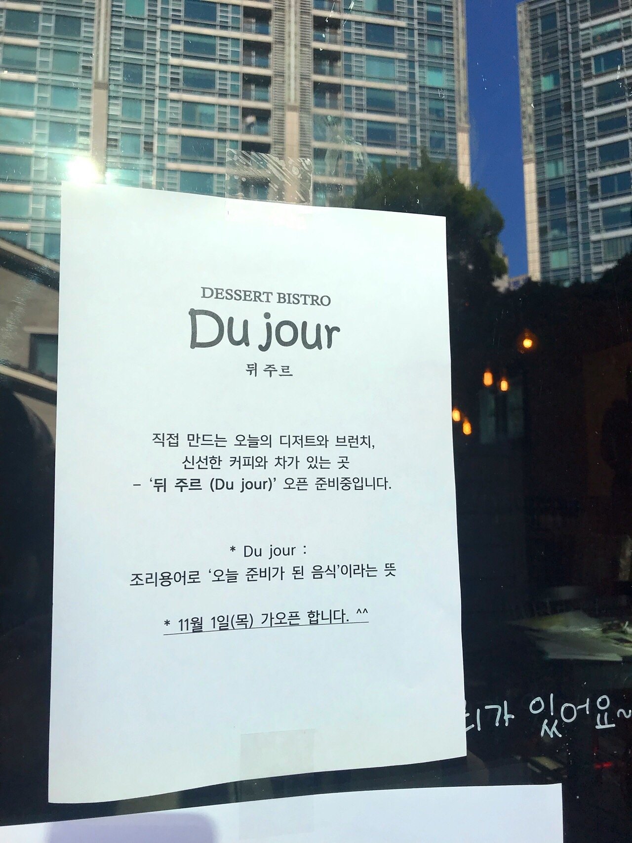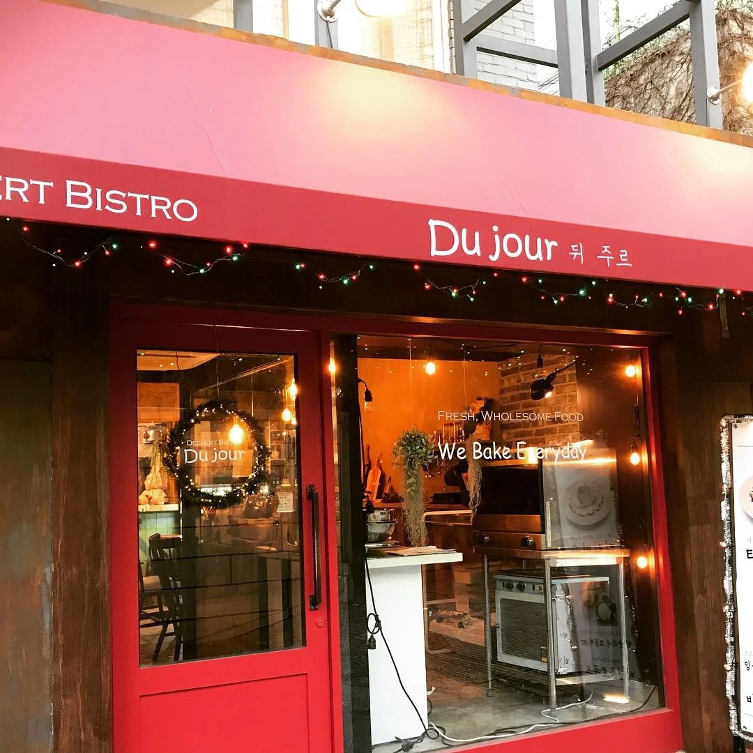 일주일이 더 지나서야 기존의 팥빙수 전문점 간판을 철거하고 밝은 버건디 색 차양을 달았다. 어닝 아래쪽에 디저트 비스트로 뒤 주르 Dessert Bistro Du Jour라는 글씨를 넣었다. 비로소 가게가 새 옷을 입은 것이다.