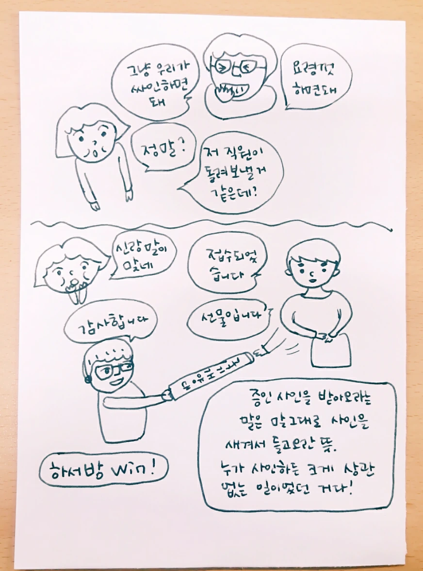 증인 사인을 못 받아왔다고 말하니까