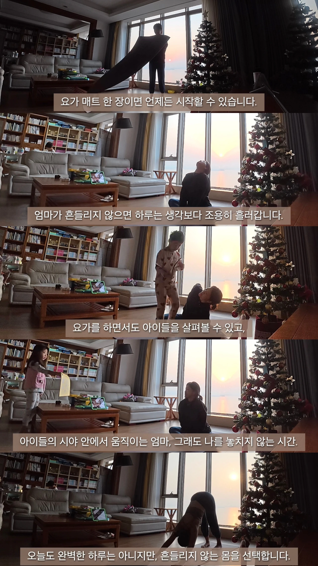 아이들의 시야 안에서, 거실 한구석에서 매트를 펴요.
