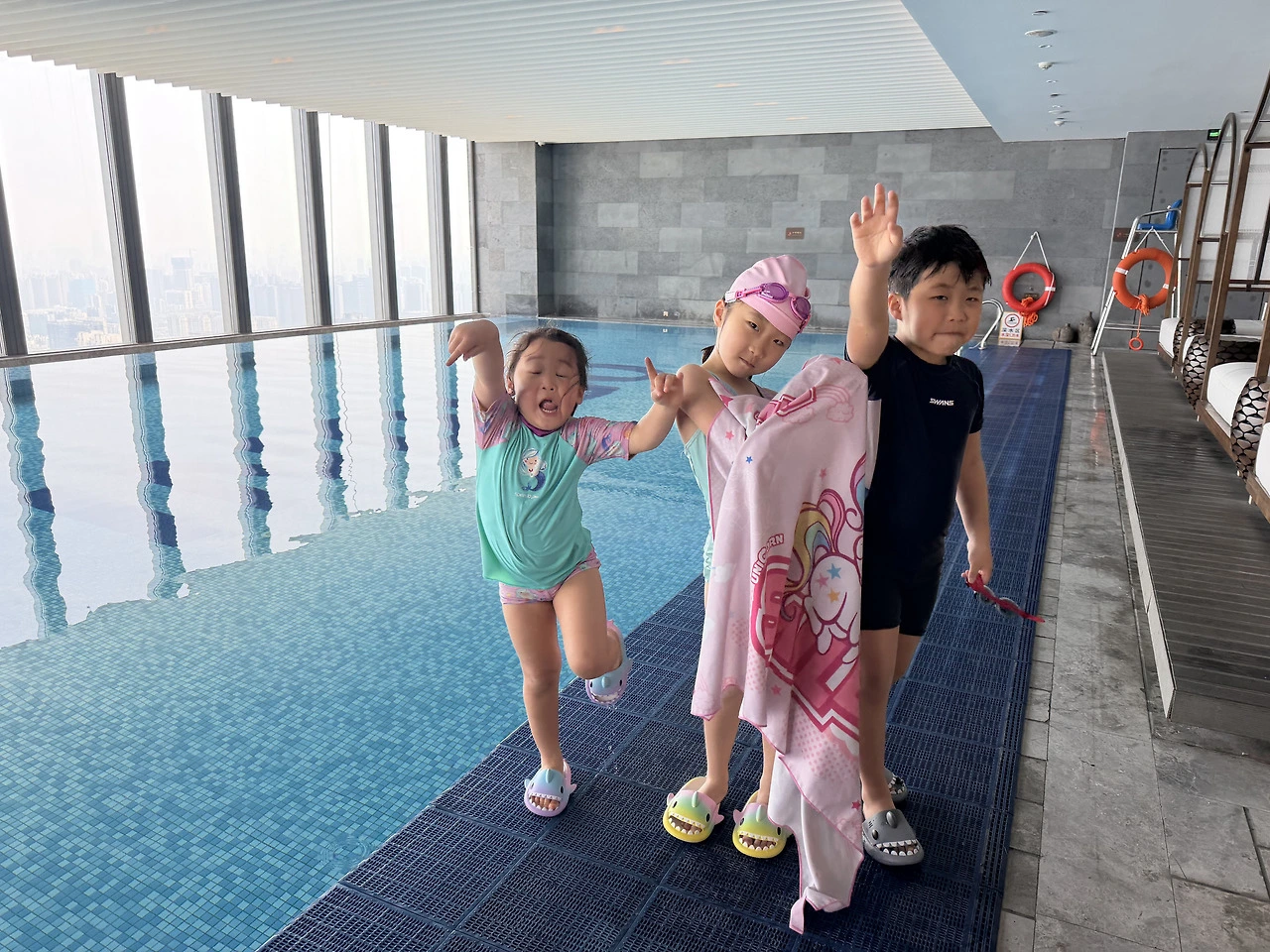 아이들을 수영장에 넣어두고,