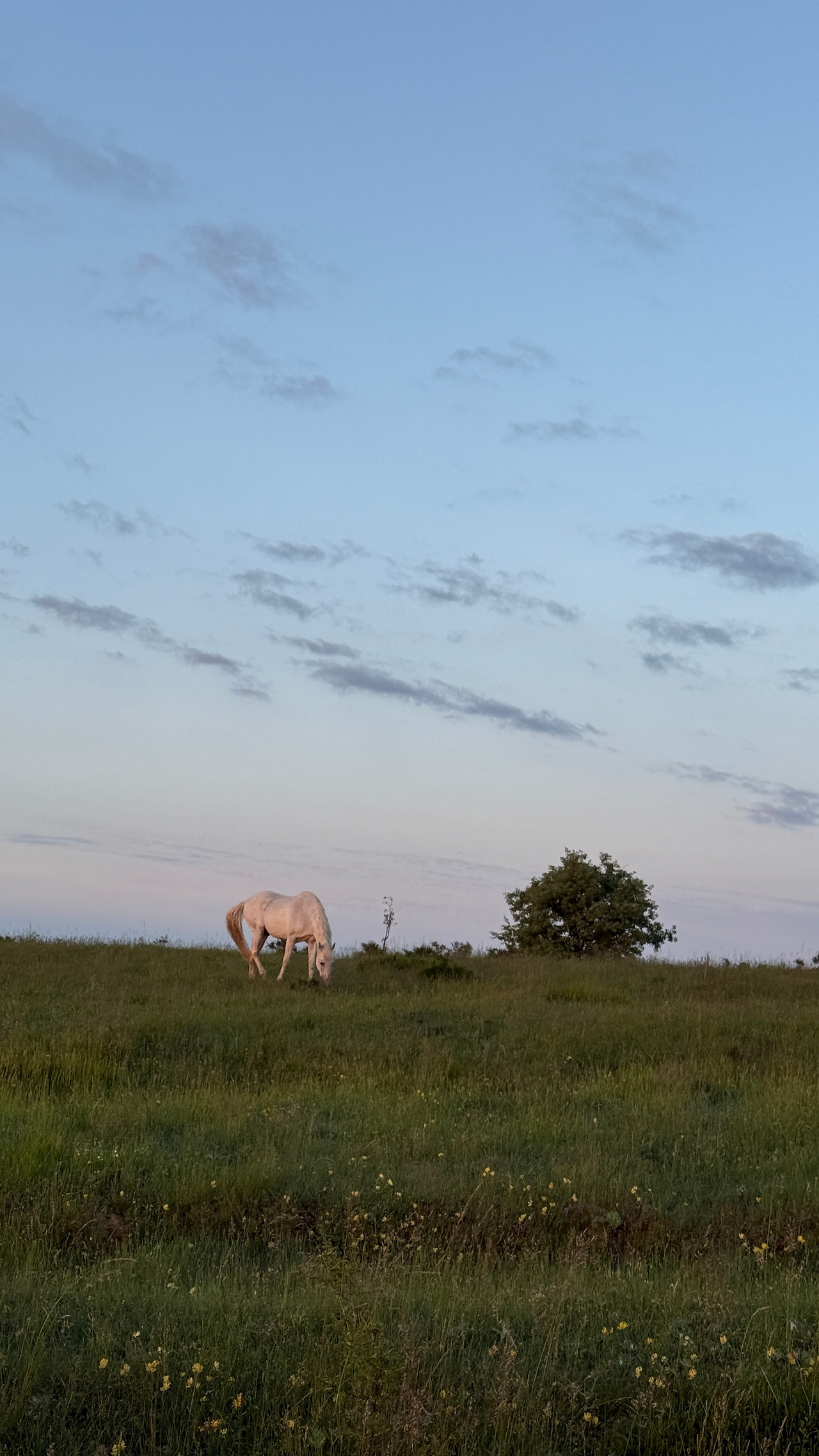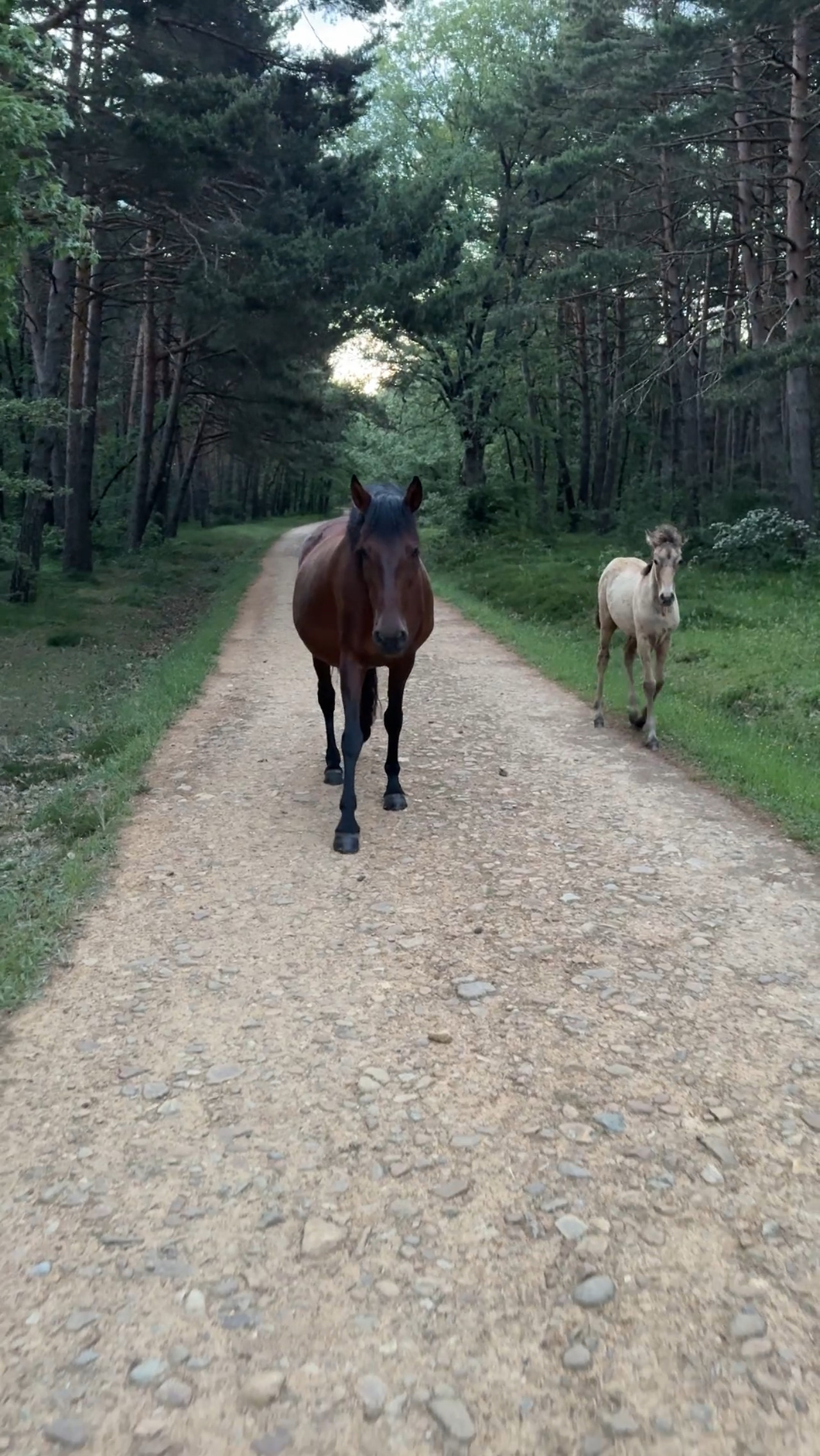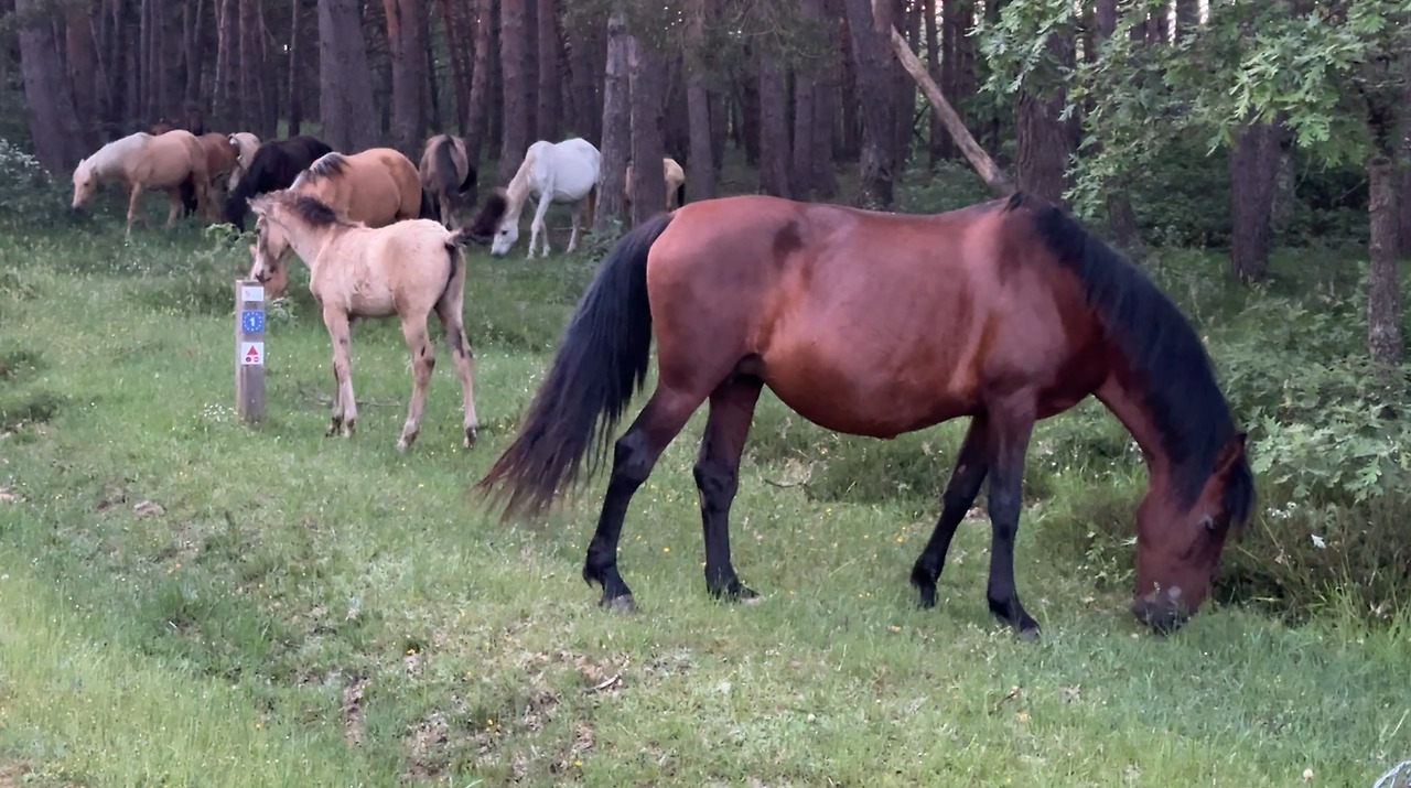 약속대로 6시에 서로의 알베르게 중간쯤에서 만났다. 아침에 일어나 크록스를 신고 어기적 어기적 양치를 하러 갈 땐 이 발 상태로 도대체 어찌 걷지 싶다가도 신발을 신고 가방을 멘 후 허리 후크를 탁 채우는 순간 순례자 모드가 된다. <유주얼 서스펙트>에서 다리를 절다 점차 똑바로 걷게 되는 카이저 소제라고나 할까. “다리 저는 애가 범인”의 그 범인 말이다. 6시 반쯤이 일출 시간이라 6시 경에는 이미 어둠은 어느정도 걷혀있다. 시작과 동시에 산길이 시작돼 약간의 오르막을 오르는데 순례자는 우리 넷 말곤 없었다. 주변을 살피며 걸어가는데 왼편으로 나무 너머 갈색빛의 동물들이 우리와 같은 방향으로 걷는게 슬쩍 슬쩍 보였다. 좀 더 자세히 들여다보니 짙은 갈색, 연한 갈색, 흰색 등 꽤 여러 마리의 무리가 보였다. 꼬리털과 갈기도 보였다. 말 떼였다. 고삐는 물론 목에 방울 조차 없는, 말 그대로 자연 상태의 말들이었다.