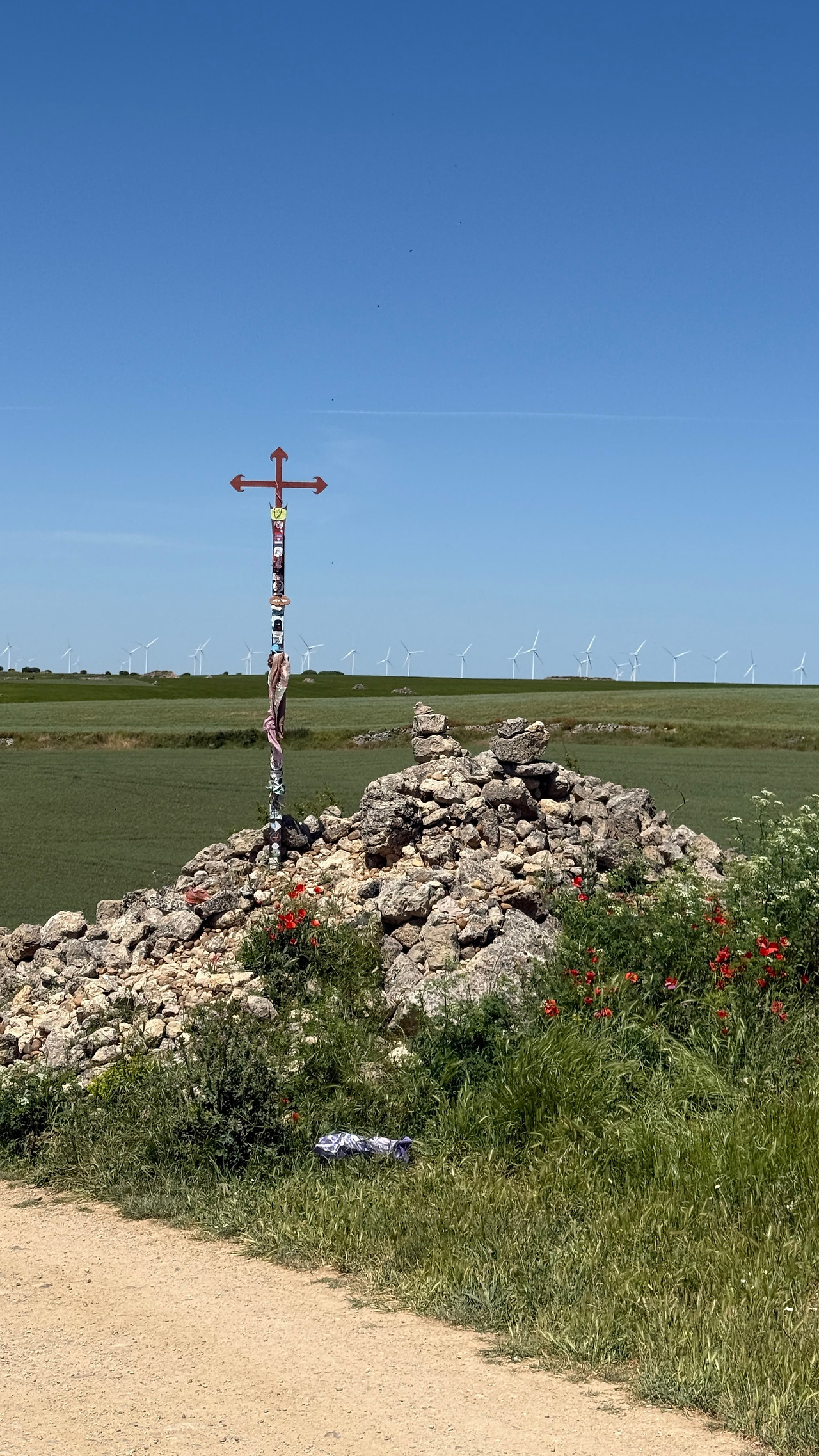 조금 걷다 보니 작은 예배당이 나왔고 그 앞에 순례자들이 삼삼오오 모여있었다. 들어가 보니 수녀님 한 분이 세요(스탬프)를 찍어주고 실로 엮은 작은 펜던트를 나눠주며 축복해주고 계셨다. 나 또한 들어가 도장을 받은 뒤 뜻 모를 스페인어로 축복을 받았다. 수많은 순례자들이 거쳐갈 텐데 수녀님은 지친 기색 하나 없이 한 명 한 명에게 정성껏 기도해 주셨다. 조금 더 걷다 보니 호진을 따라잡았다. 호진은 어제 신발에서 복숭아뼈가 닿는 부분을 칼로 살짝 도려내고 오늘부터는 샌들 대신 다시 신발을 신고 걷는 중이었다. 대화를 좀 하며 걸으니 2/3 지점 마을에 도착했다. 아침을 거른 호진은 그곳에서 점심을 먹고 나는 제로 콜라 한 잔을 마셨다. 더운 날 땀을 흘리고 마시는 콜라는 정말이지 위대하다. 새삼 감동을 받아 인터넷에 코카콜라 발명가 이름을 검색해 외워놨다. 존 펨버턴이라는 인물이란다.