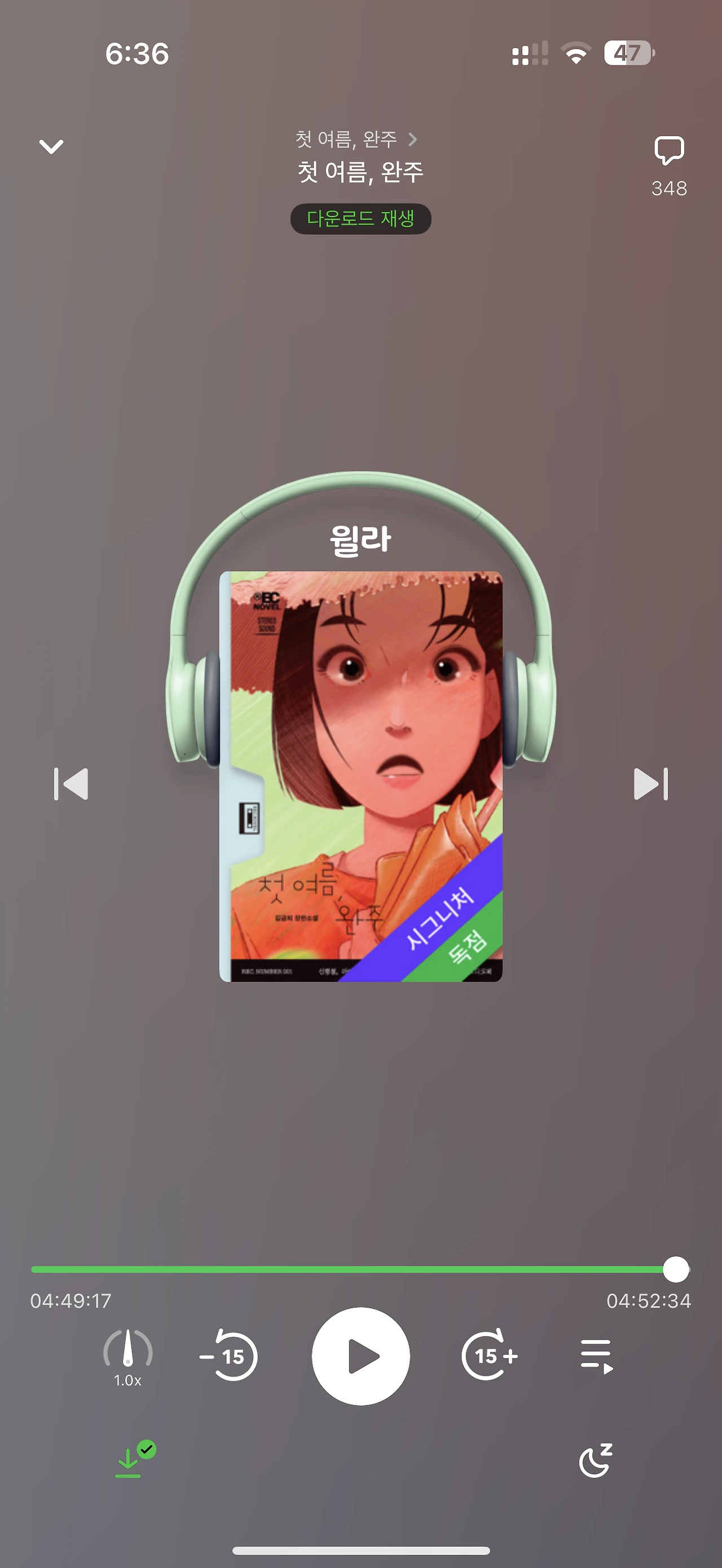 <첫 여름, 완주>의 주인공 열매는 여러 개인적 사정으로 ‘완주’라는 곳에 잠시 둥지를 튼다. 워낙 감각적인 묘사와 낭독하는 배우들의 열연이 더해져 완주는 눈에 보일 듯 훤했고 그곳의 풀 냄새, 물 냄새, 밥 냄새를 맡을 수 있었다. 숲 속에서 손열매가 어저귀를 만나는 장면에서 풍기는 다소 초현실적이고 낭만적인 분위기는 단순하고 심심한 순례길을 환상 속의 공간으로 둔갑시켰다. 매미 소리 진동하는 땀 냄새 가득한 시골 여름이었다면 오늘의 순례를 다소 힘겹게 했을지 모르는 일이지만, 제목이나 작중의 시간적 배경에 반해 소설 속에서 끈적하고 무더운 여름을 드러내는 묘사나 대사는 별로 없어서 예상보다 시원하게 들을 수 있었다.