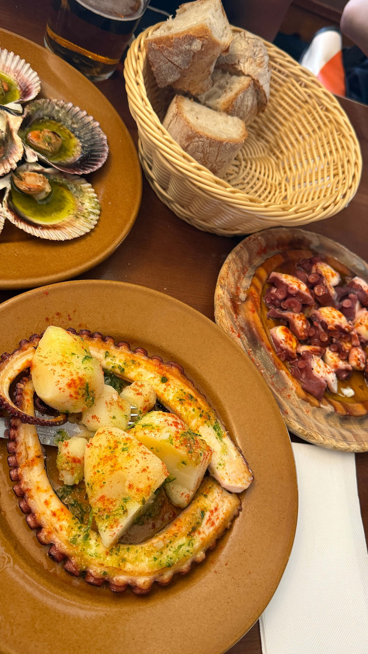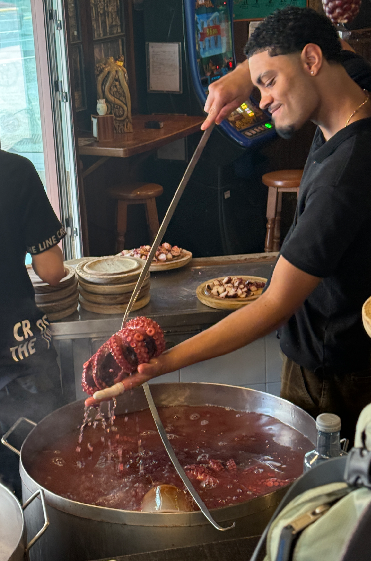 남은 8km도 진, 수빈을 쫓아가며 순례자들을 제쳤다. 한 서양인 아줌마가 우리를 보고 “speed up! speed up!” 하며 먼저 보내줬는데, 진심 어린 응원인지 바보 같은 순례자들을 비웃은 건지는 모르겠다. 덕분에 목적지 멜리데까지 순식간이었다. 오늘은 다섯 모두 알베르게 예약을 미리 해둔 덕에 침대를 선점할 필요 없이 마을 중심부에 있는 유명한 문어요릿집에 먼저 들렀다. 아주 넓은 규모인데도 웨이팅을 세울 만큼 대박집이었다. 몇 명인지 모를 많은 직원들이 쉴 새 없이 움직였다. 문어를 삶는 거대한 솥 근처에 앉아 직원들이 통문어를 건져내는 모습도 볼 수 있었다. 삶은 문어, 구운 문어, 조개찜 등과 맥주, 콜라를 시켜 배불리 먹었다. 게눈 감추듯 먹고 구운 문어를 추가 주문해 먹었다. 누가 사장일까, 하루에 문어 몇 마리를 잡을까 등등 답 모를 이야기들을 하며 오늘 하루 순례의 끝을 즐겼다. 식당을 나와 알베르게로 오는 길에 츄로스 집이 있어 들렀다. 그저께 갔던 사리아의 츄로스 집에서 망쳤던 기분을 회복할 만큼 친절하고 맛있는 가게였다. 얼마 나오지도 않아서, 문어와 츄로스로 기분이 좋아진 내가 쐈다.