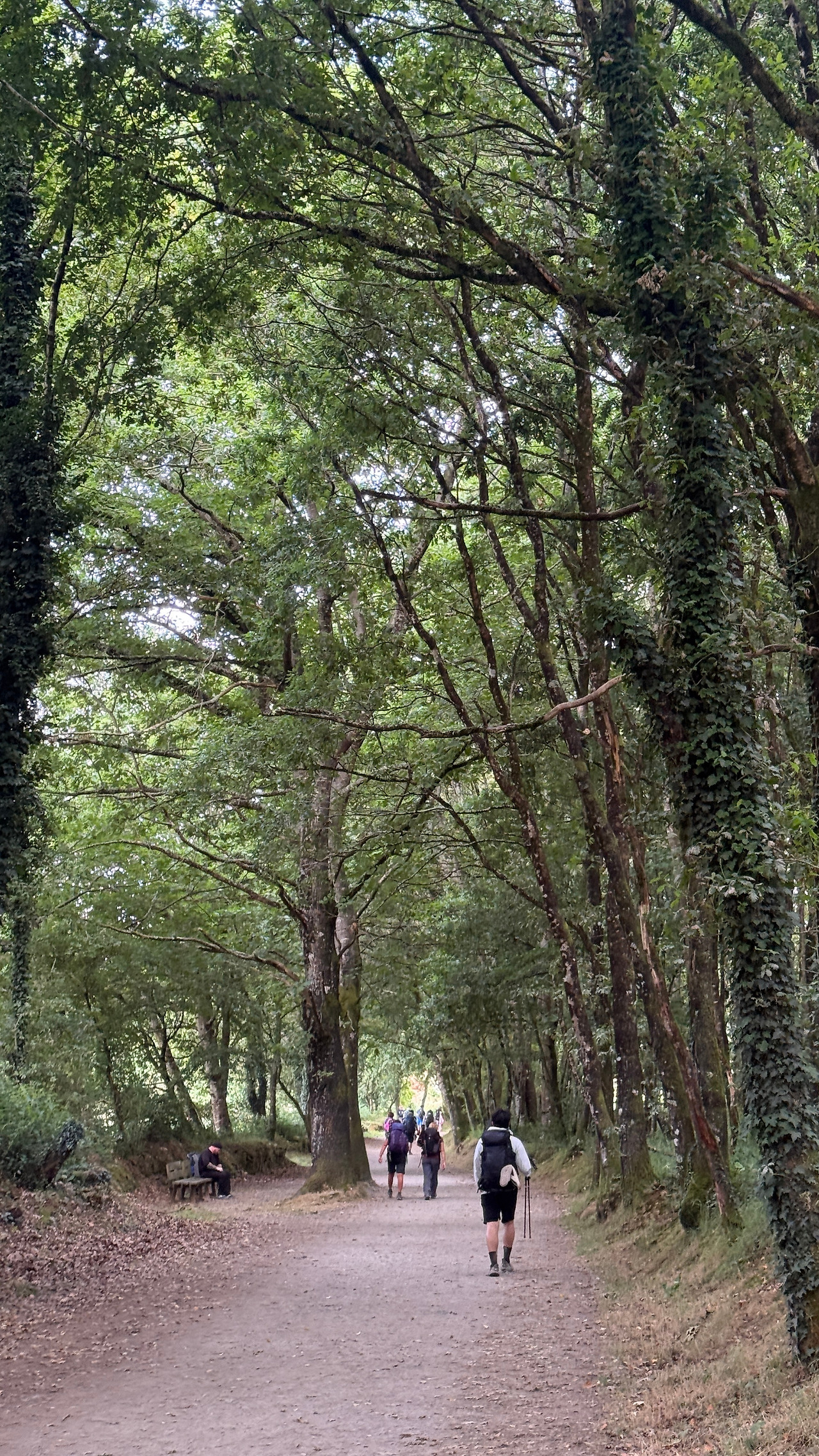 바를 나와 걸은 지 얼마 되지 않아 나는 생각이 바뀌었다. ‘굳이 19km를 남겨 놓고 하루를 넘긴다고?’ 게다가 어떤 순례자도 50키로가 넘게 걸었다는 건 듣도 보도 못했으므로 이건 해내기만 하면 자랑거리였고 정말 큰 추억거리가 될 것이 분명했다. 순례 여정 중의 평범한 하루였다면 결코 생각도 하지 않을 거리고 생각할 필요도 없는 짓이지만 이건 그 끝에 산티아고 데 콤포스텔라가 있었다. 힘은 들지만 다섯 중 누구 하나 어디가 특별히 아프지도 않았다. 해볼 만했다. 옆에 가던 상민한테 넌지시 말했다. “기왕 얘기 나온 거, 가자“ 상민은 웃더니 뒤돌아보며 진, 수빈, 현준에게 ”앞에서 산티아고 진행하라는 명이 떨어졌습니다!“하고 외쳤다. 나는 당장 오 페드로우소의 숙소를 취소하고 전액을 날리겠다고 했더니 다들 진정하라며 일단 오 페드로우소까지 서둘러보자고 했다. 그러다 숲에 사람들이 모여있어 가보니 왁스를 녹여 도장을 찍어주는 가판대가 있었다. 갈 길이 멀고 마음은 급했지만 모두 저건 탐이 났다. 다섯 명 모두 쪼르르 줄을 서서 가위바위보를 했다. 1인당 2유로, 5명이면 10유로를 건 한 판. 진이 걸렸다. 버너로 왁스를 녹여 한 땀 한 땀 도장을 찍고 색칠까지 해주는 탓에 속도가 매우 더뎠다. 거기서만 20분 이상 쓴 것 같다. 다섯 모두 같은 색 같은 디자인의 도장을 받고 다시 출발했다. 그야말로 분노의 질주였다. 진과 수빈은 기존에도 빨랐지만 오늘은 나와 상민도 달렸다. 누가 앞장서든 1km에 8분대 페이스였다. 내리막을 달려 내려갈 땐 최대 5분대가 찍히기도 했다. 수빈이 웃으며 자신이 러닝을 할 때도 이 페이스는 안 나온다고 했다.