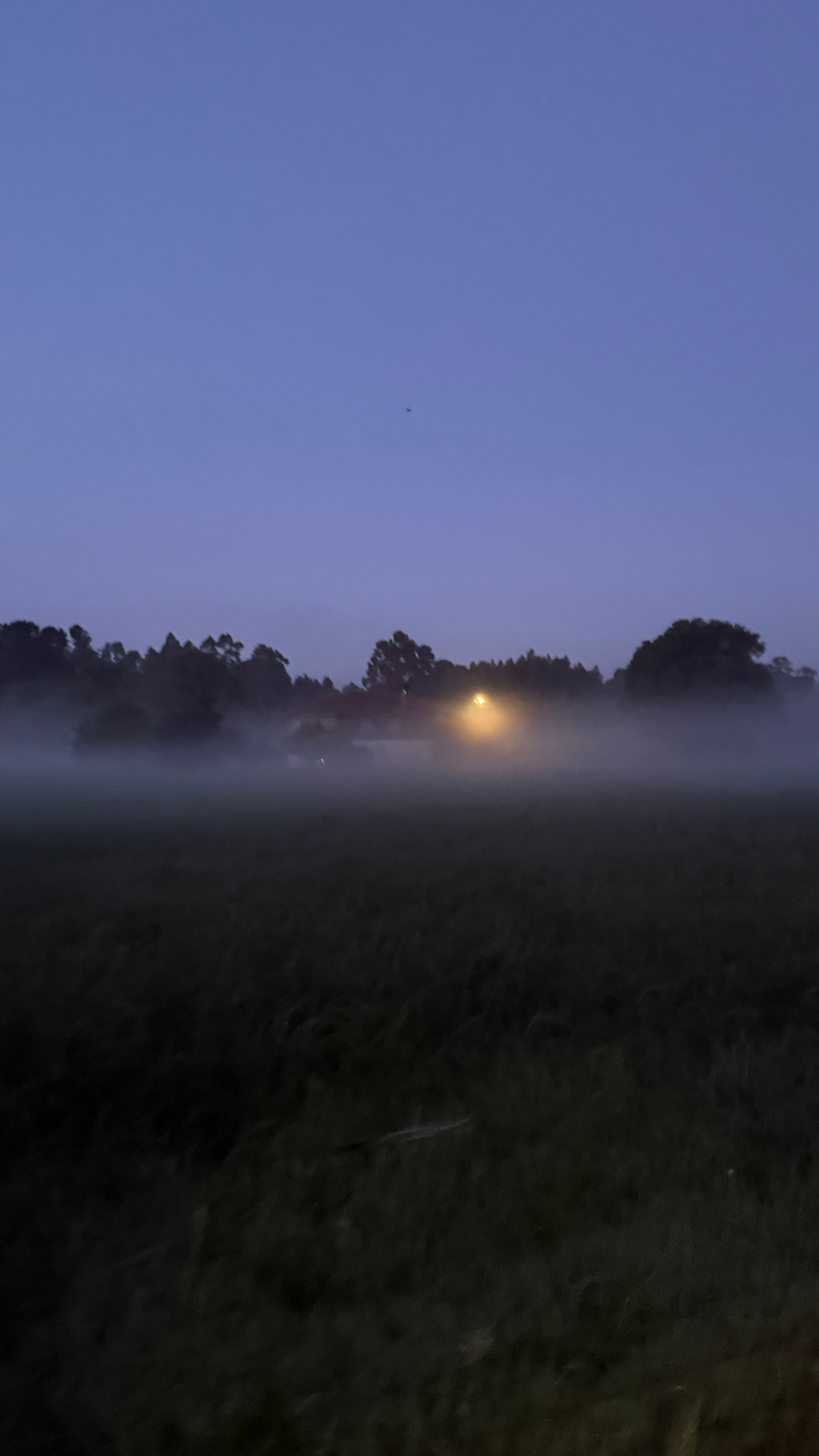 묵었던 알베르게에는 조식이 선택이 아닌 필수였다. 기왕 조식 값까지 낸 거 먹고 가야겠다는 생각에 4시 50분경 일어나 짐을 모두 챙겨 1층으로 내려갔다. 전날 밤에 호스트가 준비해 둔 빵, 과일들과 직접 갈아 마실 수 있는 오렌지 주스, 직접 내려 먹는 커피 등이 준비돼 있었다. 냉장고에서 요플레를 꺼내 블루베리를 넣어 먹고, 커피를 내려 마시고 오렌지 두 개를 갈아 주스를 만들어 먹었다. 잘게 잘라놓은 케익도 있었는데 서서 한두 개 집어 먹다 보니 맛이 있어 꽤 많이 먹었다. 그리고 출발한 시간이 5시 반쯤. 오늘은 산티아고 데 콤포스텔라까지 약 19km를 남겨둔 마을인 오 페드로우소까지 약 33km를 가는 날이다(당초 계획은 그랬다. 뒤에서 설명할 예정). 짧지 않은 거리이므로 날이 더워지기 전에 도착하기 위해 새벽부터 가열차게 걸었다. 박명이 생기며 사위가 밝아지자 낮고 짙게 깔린 안개가 평원을 덮고 있었다. 키가 큰 나무들보다도 낮은 안개라 새로운 분위기였다.