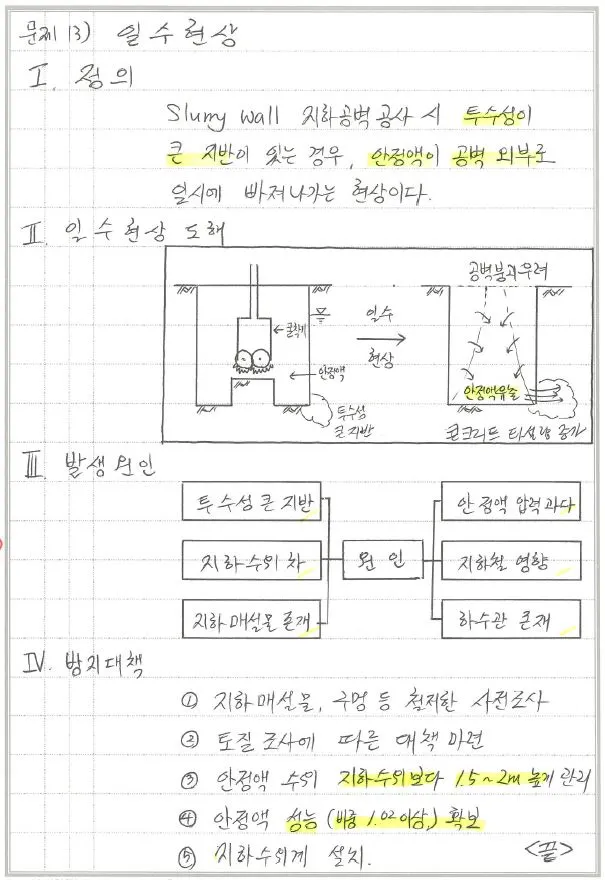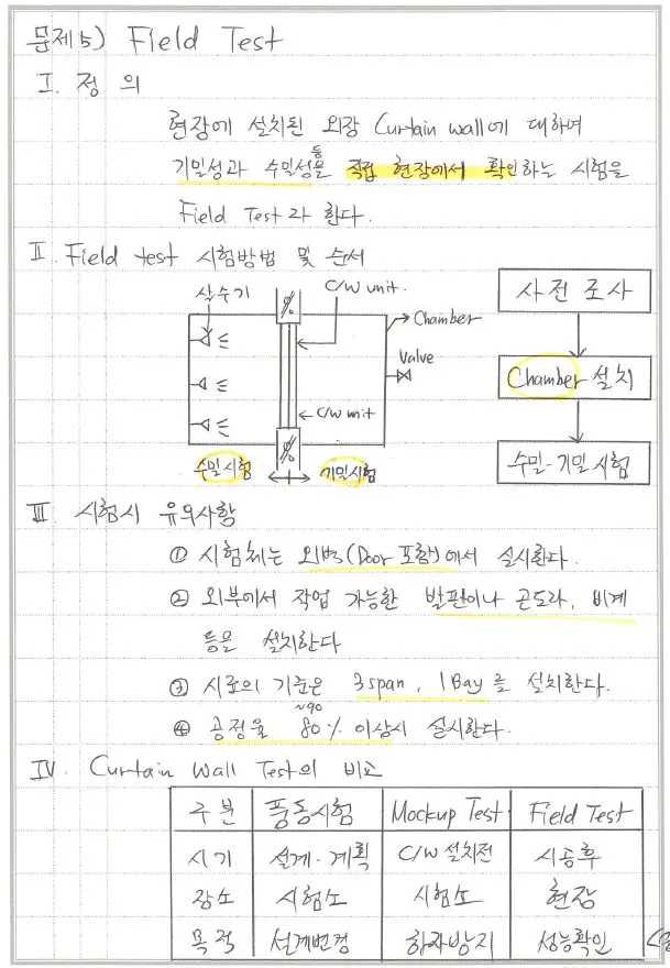4) Ⅱ항목에서 답안지에 임팩트를 줄 수 있어야 한다. 그림을 잘 그리는 것이 최고의 방법인데, 그림을 넣을 수 없는 유형의 문제라면 공식을 넣거나, 시공순서를 네모 박스와 화살표로 그리는 것도 방법이다. Ⅲ과 Ⅳ를 둘 다 ①②③식의 서술형으로 할 수도 있으나, 좀 더 차별화된 답안지를 작성하려면 둘 중에 하나만 서술을 하고 한 곳에는 비교표나 도형을 꼭 넣도록 하자.
