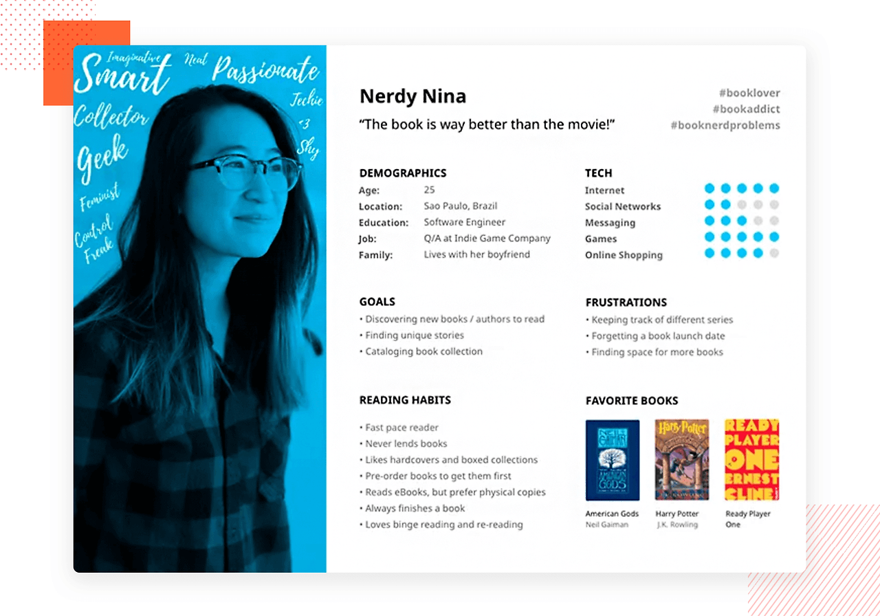 대학원에서 UX 수업을 들었을 때 퍼소나에 관해 처음으로 배운 적이 있다. 아래와 같은 이미지를 보여주며 퍼소나를 설명할 땐 이런 정보들이 들어가야 한다고 배웠다. 하지만 이런 정보들이 왜 들어가야 하는지 정확한 설명은 듣지 못했다. 그랬기 때문에 조별 과제를 하며 기계처럼(왜 해야 하는지도 모른 체) 이름도 정하고, 가상 나이도 정하고 퍼소나를 한 문장으로 전달할 수 있는 카피도 정했다.