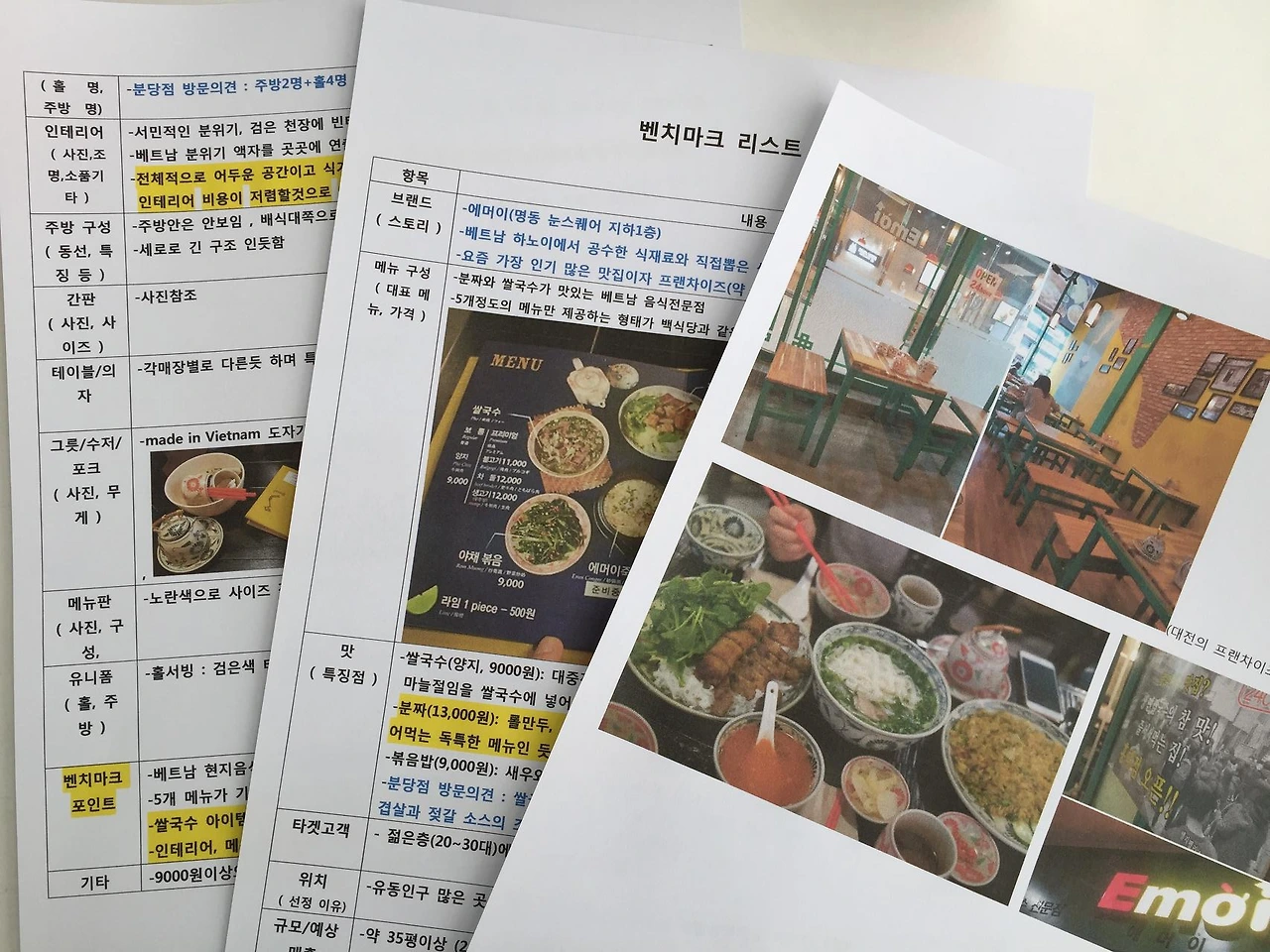 부족한 부분을 채우기 위하여 현장 방문과 자료 수집을 시작했다. 그동안은 식사를 위해서 무심하게 갔던 식당도 의도적으로 선택하여 방문했고 방문 후에는 꼭 리포트를 작성했다. 맛, 가격, 인테리어, 차별화 요소, 손님의 구성, 내가 본 성공의 이유 등 가능한 많은 정보를 기록했다. 필요한 곳은 재방문은 물론 3,4차례 방문했고 근처에 있는 식당들도 같이 방문했다. 어느 날은 점심과 저녁을 합쳐서 6군데를 방문하기도 했다. 경험과 시간이 없기 때문에 가급적 많은 정보가 필요했기 때문이다. 또한 사람의 기억은 한계가 있어 글로 남기는 것이 도움이 된다.