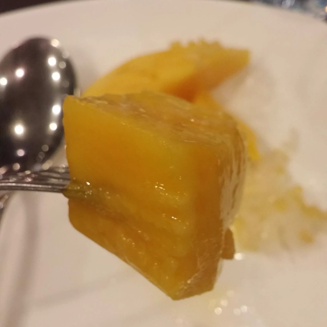 "Mango sticky rice"라는 다소 희한한 이름의 디저트다. 이름만 들어서는 어떤 요리인지 잘 상상이 되지 않았었는데 태국 레스토랑에서도 디저트로 추천하는 메뉴고 푸드코트의 평범한 식당에서도 따로 홍보용 이미지를 붙여둘 만큼 방콕에서 인기다. 밥을 다 먹고 난 후 만나는 게 디저트인지라 배 부른 뒤에 나오는 음식은 흥미가 떨어지기 마련인데, 아무리 배가 불러도 달고 부드러운 태국산 망고와 코코넛 워터로 간을 한 달고 짭짤하며 일부 바삭하고 일부 끈쩍한 텍스처가 환상적인 밥의 조화는 그 어떤 요리보다 훌륭하다. 크고 신선하며 부드러운 망고와 코코넛 맛이 나는 끈끈한 밥의 조화는 배가 언제 불렀나 싶게 계속 손이 가는, 방콕 최고의 요리로 추천한다.
