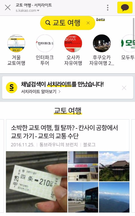 다시 정신을 다잡고 검색창에 "교토여행"을 입력했다. 찾았다! 카카오채널에 브런치 포스트 글이 노출되는 알고리즘은 알 수 없지만 카카오채널 홈에서 "교토여행"을 검색했을 때 거의 최상단에 내 포스팅이 뜬다. 10여 개의 글이 순서대로 롤링되는 부분이다. 범인이 여기 있었구나 싶었는데, 어라? 내 글은 맞는데, "소박한 교토 여행, 뭘 탈까? : 칸사이 공항에서 교토 가기 - 교토의 교통 수단" 포스팅 제목이 다르다. 방문자 유입을 높이는 데 이 포스팅이 기여한 건 사실이지만 몸통은 아니었던 셈이다. 덕분에 포스팅이 카카오채널에 노출되고 있다는 걸 알게 된 소득은 있었다. 내 포스팅의 정보도 뭔가 도움이 되고 있다는 이야기니까. 좋았어!