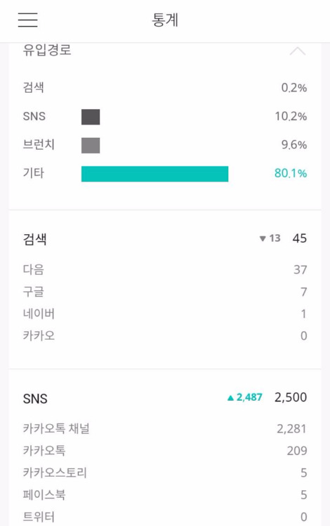 통계 메뉴를 이렇게 열심히 들여다 본적도 없는 것 같다. 유입 경로에 표시되는 저 다양한 채널을 보라. 그런데 유입률이 가장 높은 건 "기타"다. 역시 로봇? 일단 알 만한 키워드인 "카카오채널"을 찾아보기로 했다. 유입률이 매우 높은 SNS 분야로 표시된다. 카카오톡을 실행하고 채팅창 옆 탭의 신문 모양을 클릭하면 카카오채널에서 검색할 수 있는 검색창이 나오는데, 여기에 검색어를 입력하면 카카오채널로 이동하고 새 화면에서 키워드에 적합한 콘텐츠를 보여준다.