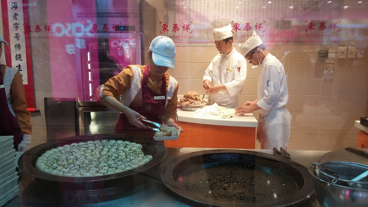 이 가게의 투명 유리창을 통해 딤섬 만드는 과정을 구경할 수 있다.