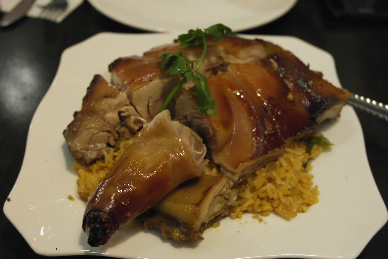 돼지고기 족발 부분을 뼈채로 바삭하게 튀겨낸 요리가 이곳 사람들이 가장 많이 선택하는 요리라고 한다. 껍질이 매우 바삭한 게 특징. 베네시안 호텔의 뷔페식 레스토랑인 뱀부(Bambu)에서도 메인 요리 중 하나가 이거였다.