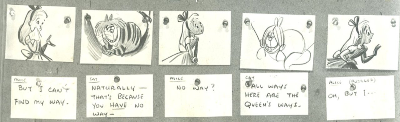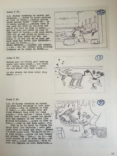 디즈니가 대단했던 것은 이 디자인 언어를 애니메이션에 적용했다는 것이다. 애니메이션은 여러 장의 그림을 차례로 하나씩 보여줘야 한다. 그 순서가 이야기를 전해야 하는 것이다. 디즈니도 처음에는 영화제작하듯이 시나리오로 시도해 보았다. 디즈니의 초기작 [윌리의 스팀보트 Will's Steamboat]에서는 글 먼저 쓰고, 그림 나중이었다.