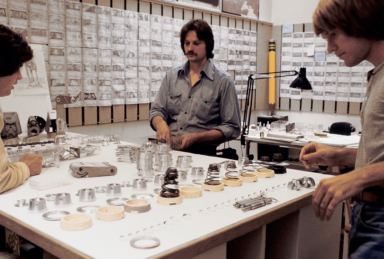 스토리보드는 스토리기획뿐만 아니라 배경이나 소품제작에도 활용되었다. 다음 사진의 벽에 붙어있는 것이 [스타워즈]의 스토리보드이고, 이것을 기준으로 소품제작을 하고 있다.