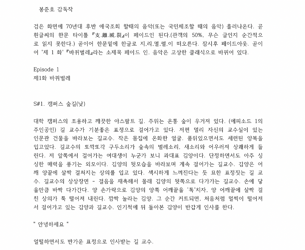 한국에서는 그림언어로 스토리보드를 하여 프리 비주얼라이제이션을 언제부터 하기 시작했는가? 제대로 한 것은 봉준호 감독 때부터였다고 본다. 이 전에는 대학에서 가르치기도 힘들었다. 선이해가 전혀 없었기 때문이었다. 사실 봉준호 감독은 이것을 알기 전부터 시나리오 자체를 그림 그리듯이 썼다. 그의 초기작 [지리멸렬]을 보면,