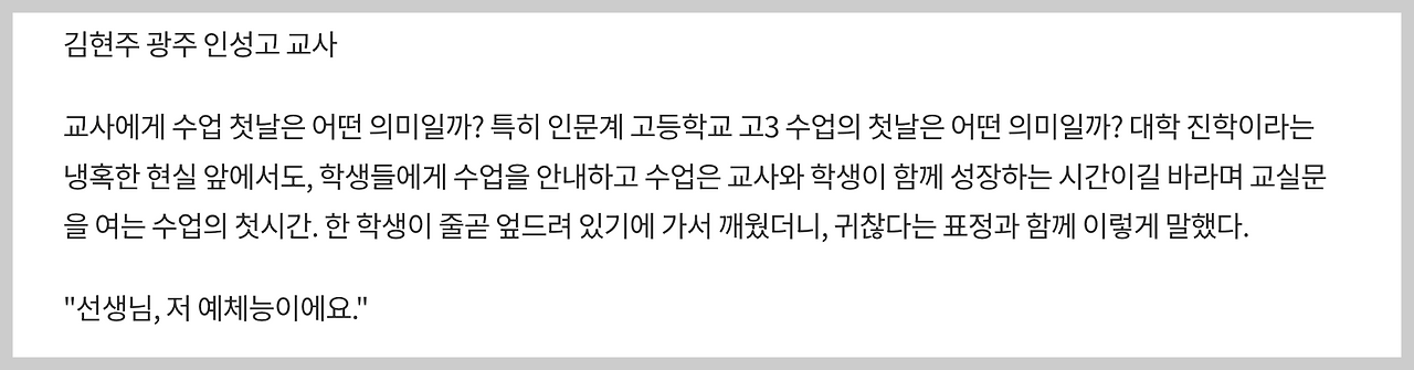 왜 한국의 예체능 학생은 공부를 안 해도 되는지? 설명을 전혀 할 수 없던 것은 아니다. "전통적으로 한국사회는 사람의 능력에 따라서 4개로 위계질서를 세운 사회이다. 맨 위에 글을 하는 문관이 있고, 그 밑에는 칼을 쓰는 무관이 있었고, 그 밑에는 돈을 다루는 상인이 있었고, 맨 밑에 기술이 있는 천인들이 있었다. 예체능은 바로 마지막 기술직에 속했다. 이처럼 한국에서는 그림을 기술에 불과하다고 생각하고, 화가처럼 창작하는 사람을 쟁이라고 천시하였다. 그 잔재가 여전히 남아서 예체능계 학생들에게 글을 가르치는 일을 소홀히 하는 것이다."