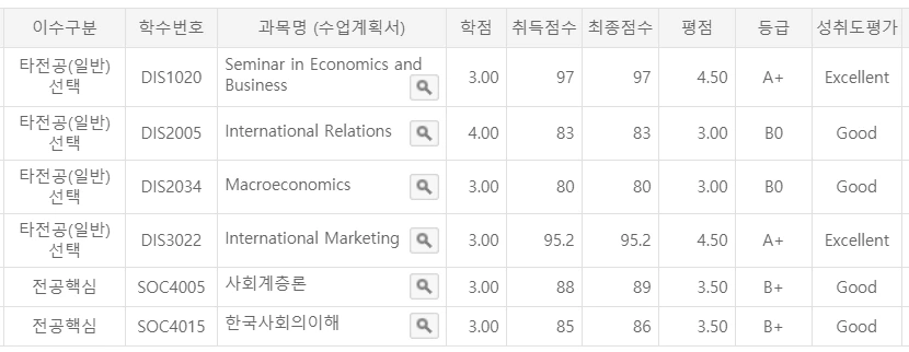2학기1년 동안 들은 수업이다. 4개 빼고 모두 영어수업이다. 역설적으로 가장 성적을 잘 받은 학기였다. 수업이 빡세니 하지 않던 예습과 복습을 한다. 술 약속도 안 잡는다. 잠도 덜 잔다. 하루하루가 시험인데 술이 넘어갈 리 없다.