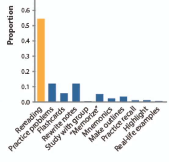 저장 전략인 다시 읽기 (Rereading)의 비율이 압도적으로 높다. 반대로 인출 전략인 다시 기억하기 (Practice recall)은 한참 뒤에 자리했다.