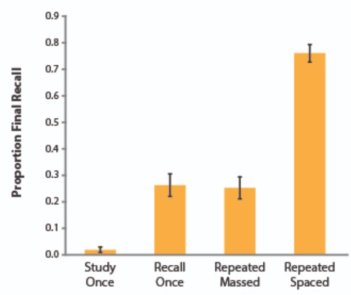스와힐리어를 학습하고 1주일 후 참가자들의 장기기억을 테스트하기 위해 "스와힐리어=?" 형식의 시험을 치렀다. 결과는 다음 그래프와 같다.