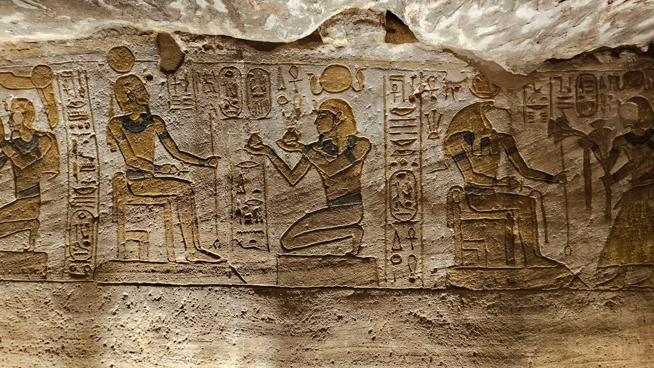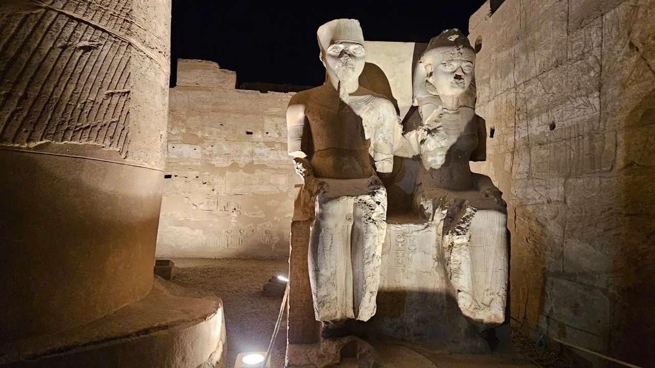 석상의 표면은 떨어져 나갔고 인물의 윤곽은 무뎌졌지만, 나란히 앉은 두 사람 사이에 깊게 파인 타원형 이름표인 카르투슈는 선명하다. 맨 위에는 태양신 라를 뜻하는 둥근 원반이 있고 그 아래로 진리의 여신 마트의 기호가 또렷하게 자리 잡고 있다. 우세르마트라, 67년을 통치했던 람세스 2세의 즉위명이다.