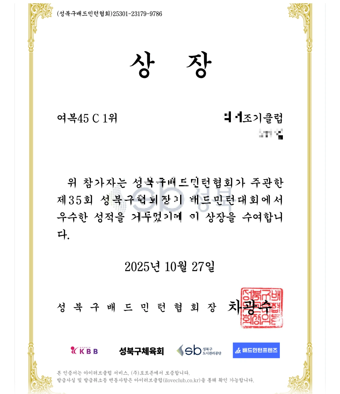 드.디.어. 지난 일요일 성북구 배드민턴대회에서 우승을 했다. 2등이나 3등은 어쩌다 한다치더라도 사실 1등을 하는 건 마니 어렵다. 결승전은 무려 7점이나 지고 있다가 역전승을 했다.