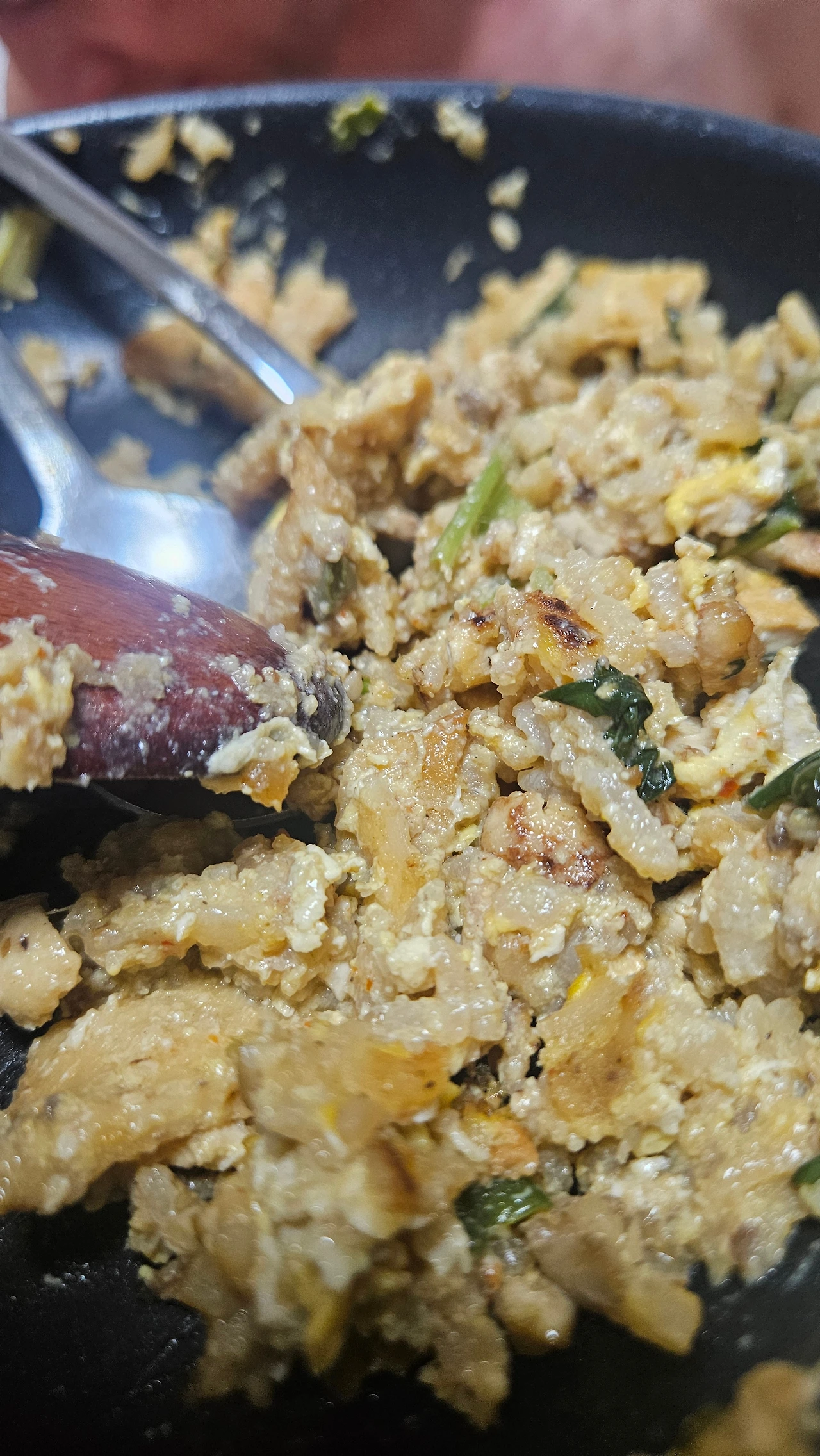 냄비와 갈색으로 변한 볶은밥이 눈이