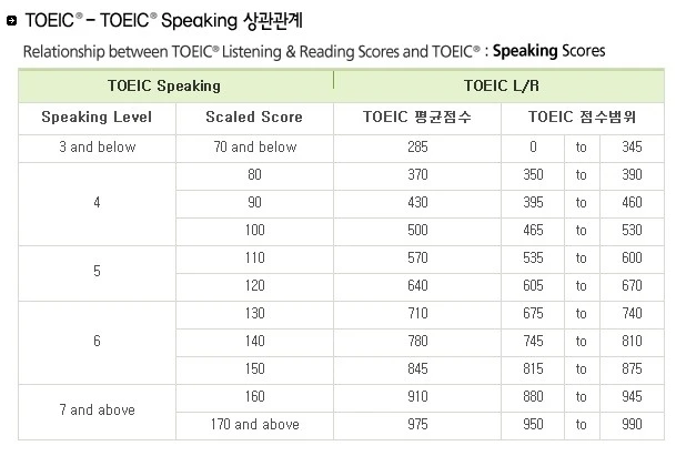 위의 표에서 보는 바와 같이 토익 710~845점까지의 점수대와 토익스피킹의 6 레벨과는 동급으로 처리되고 있다. 토익 710~845점과 토익스피킹 6 레벨 정도면 보통 회사에서 요구하고 있는 기준치의 이상되는 점수대이다. 토익 스피킹 6 레벨을 올리기가 어렵지 않냐고요? 회화는 해본 적도 없고, 간단한 대화도 영어로는 하기 힘들다고요?