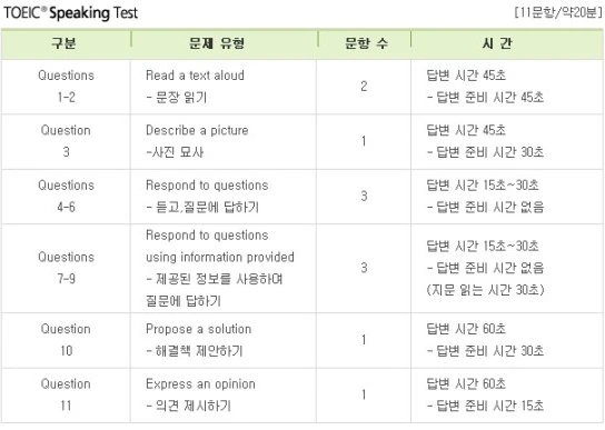 토익스피킹의 문제에 대한 답변은 대부분이 정해진 틀 내에서 이루어진다. 결론적으로 말하면 약 6개~10개 정도 되는 답변을 외우면 끝나는 것이다. 문제의 수는 총 11문제이지만 유형으로 따지면 총 6개의 유형으로 이루어져 있어서, 6개의 답변 유형을 외우고 있으면 모든 문제에 답변을 할 수 있다.