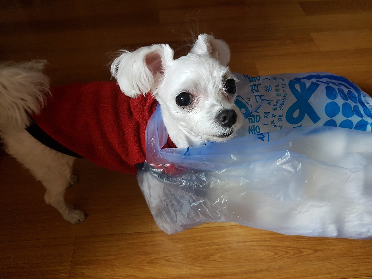 쓰레기를 뒤지려다 손잡이가 밀키 목에 걸렸다