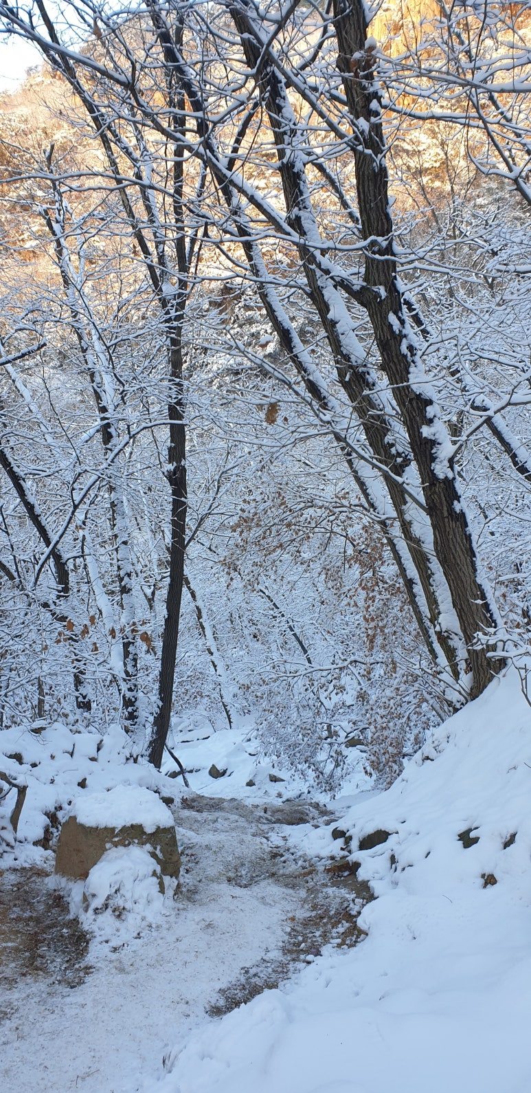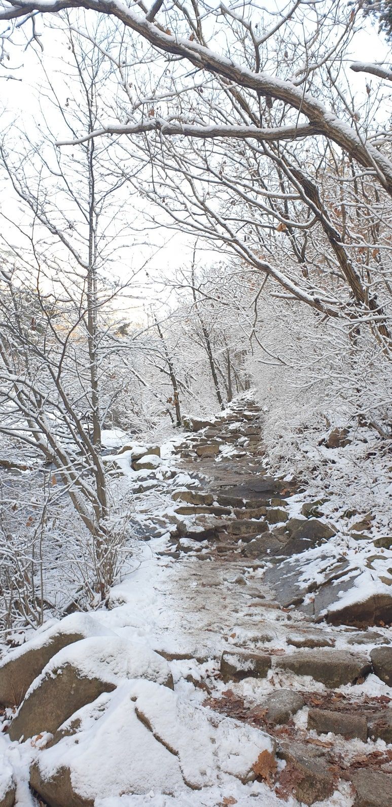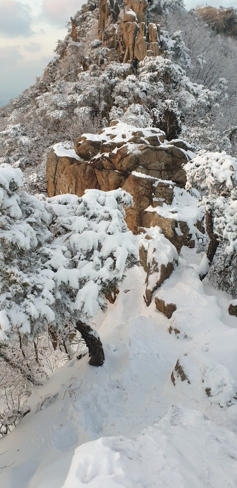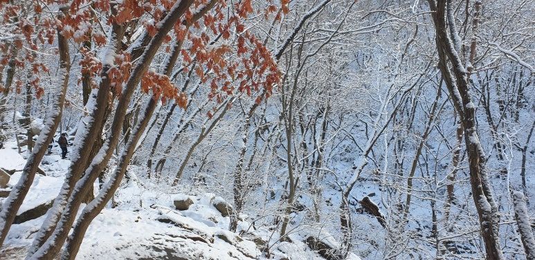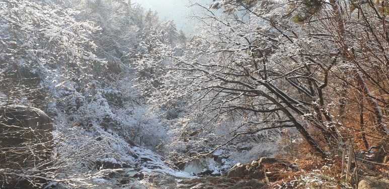 온 사방을 둘러보아도 눈, 미칠 듯이 기쁜 눈 세상이다. 겨우내 나뭇잎 하나 없이 제 몸으로만 서 있던 겨울나무에 눈이 쌓이니 상고대와 눈의 무게를 못 이기고 휘어진 나뭇가지가 환상적인 눈꽃 터널을 이루며 관악산 바위들과 어우러져 걸음을 옮길 때마다 동양화 같은 풍경이 그려진다.