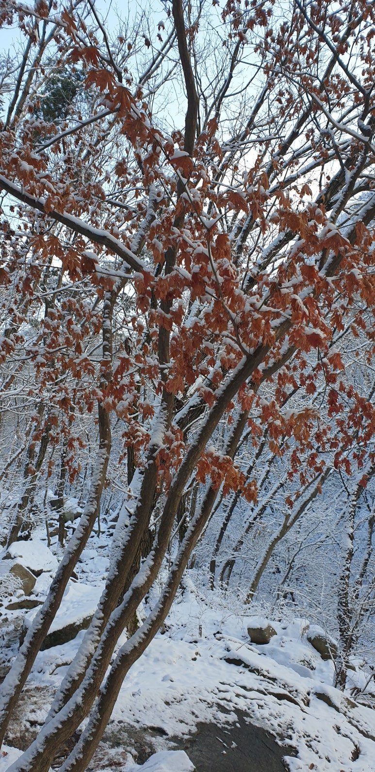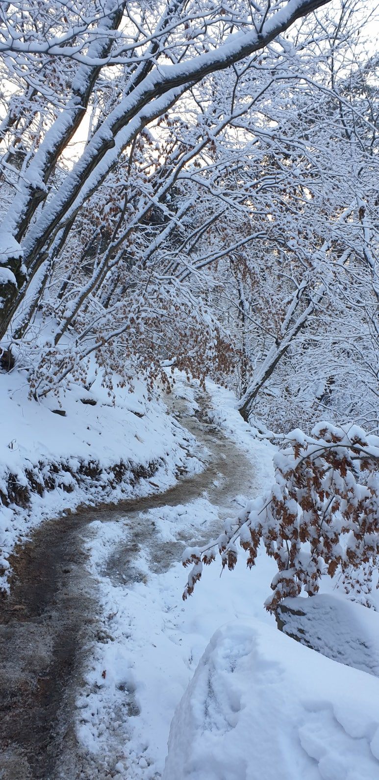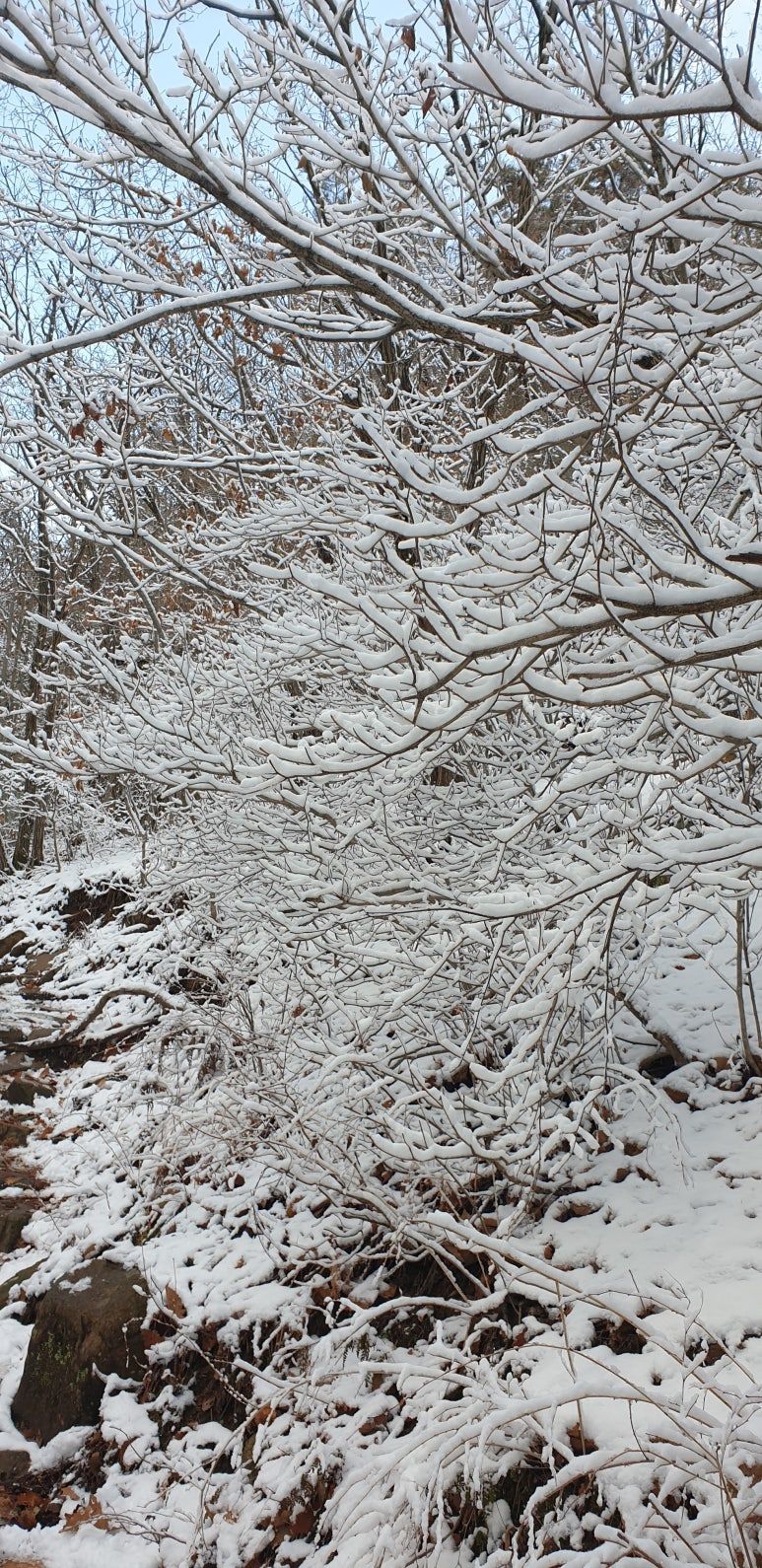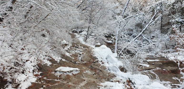 온 사방을 둘러보아도 눈, 미칠 듯이 기쁜 눈 세상이다. 겨우내 나뭇잎 하나 없이 제 몸으로만 서 있던 겨울나무에 눈이 쌓이니 상고대와 눈의 무게를 못 이기고 휘어진 나뭇가지가 환상적인 눈꽃 터널을 이루며 관악산 바위들과 어우러져 걸음을 옮길 때마다 동양화 같은 풍경이 그려진다.