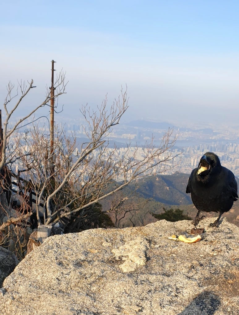 인근에 앉아 간식을 먹고 있던 사람들이 바나나를 부리에 물려주니 먹지 않고 바위에 그대로 둔다. "바나나 따위 탐내지 않는다, 더 달고 맛있는 당신들의 미식 생활을 내놓아라." 사람 친화적이 되어버려 이미 사람이 먹는 것에 대한 탐구가 끝난 관악산 까마귀들이다. 마침 사당 능선을 타고 막 올라온 등산객이 숨찬 것도 뒤로하고 신기해하며 치아바타 빵을 뜯어 주자 입맛에 맞지 않는지 받자마자 떨어뜨리는 이 까칠한 까마귀 씨, 카스텔라 빵은 맛있게 먹던 걸 예전에 본 적이 있다.