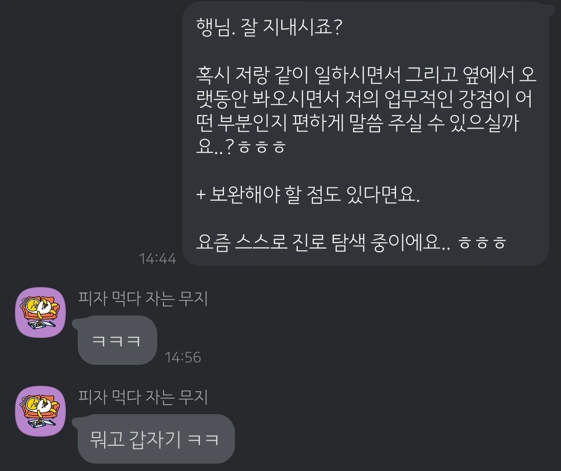 바로 옆자리에서 나를 3년간 매일 봐온 친한 직장동료 형이 있다. 어느 날 형에게 카톡으로 물었다.